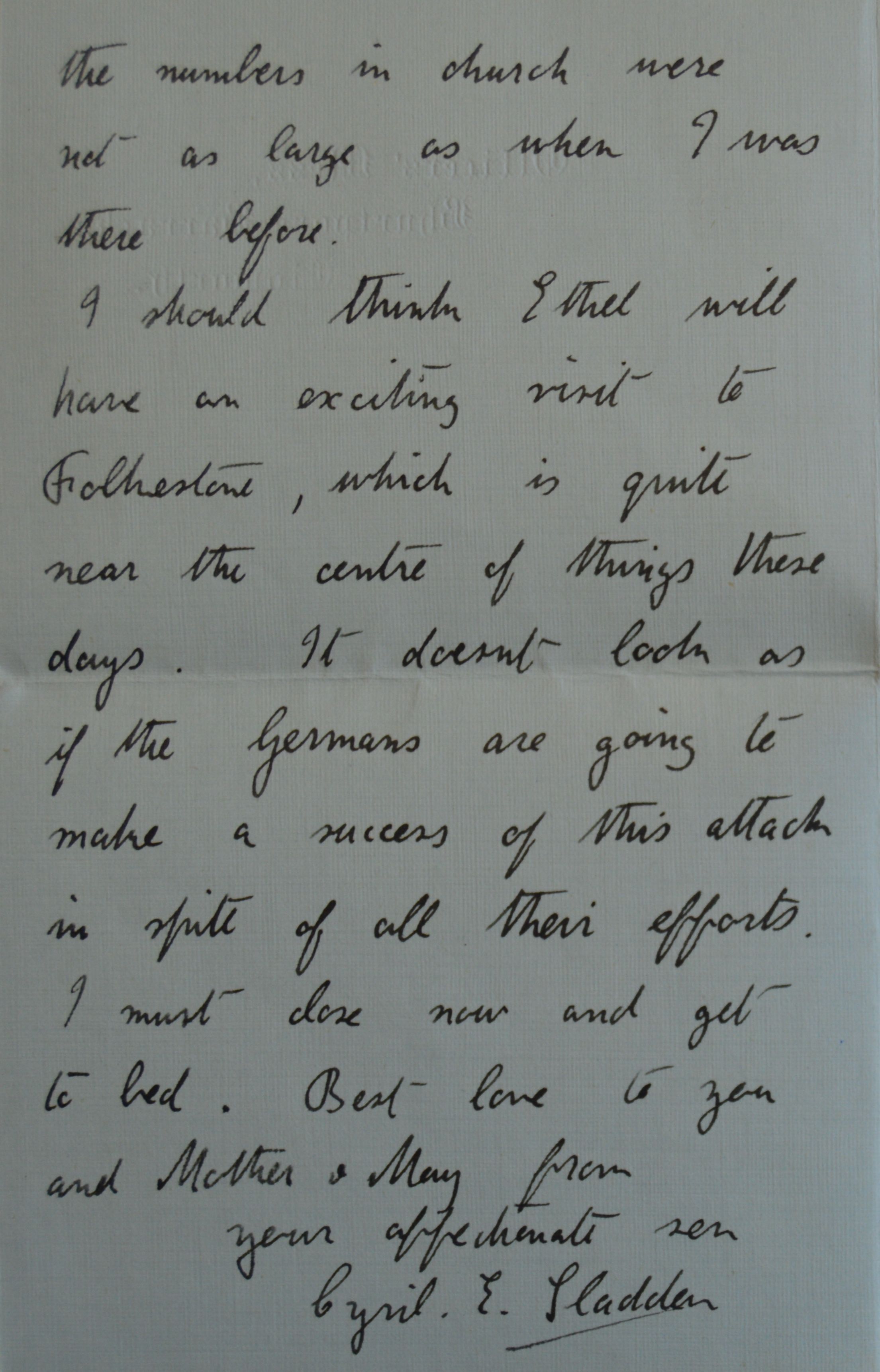 On Sunday evening I went to the Garrison Church, where Bishop Taylor-Smith was preaching. He is a fine preacher, and gave a very good sermon. It was such a wet evening that the numbers in church were not as large as when I was there before. I should think Ethel will have an exciting visit to Folkestone, which is quite near the centre of things these days. It doesn’t look as if the Germans are going to make a success of this attack in spite of all their efforts.