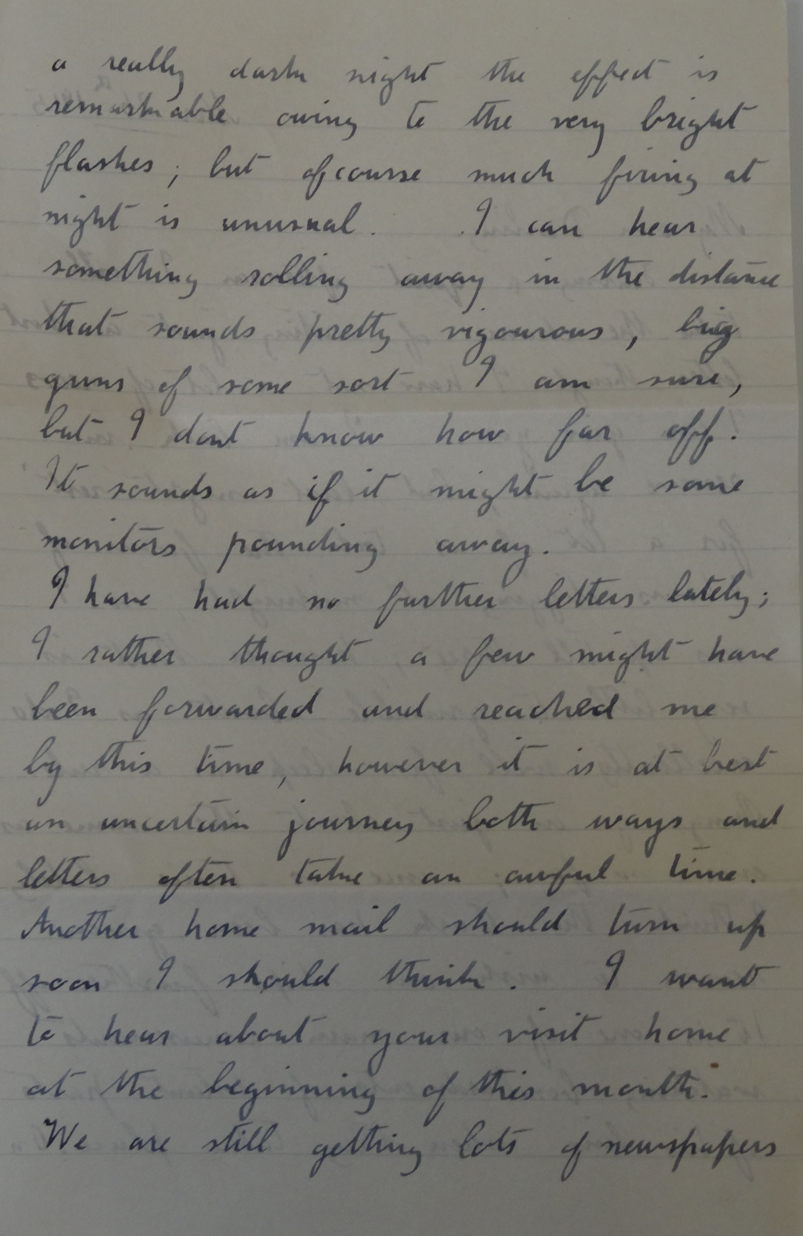 Having a quiet afternoon I will take the chance of writing just a short letter though I have not a lot of news I can give you. I am back in reserve again, but last night "rest" for a lot of us took the form of 3 hours digging at midnight, so I was up till three; however that is very little to grumble about as I do excellently well for sleep as a rule. Things go on just about the same as ever so far; once or twice lately I think the Push has been given reason to wish our ships further off. It is one of our main amusements watching bombardments of distant part of his line when they take place. On a really dark night the effect is remarkable owing to the very bright flashes; but of course much firing at night is unusual. I can hear something rolling away in the distance that sounds pretty vigorous, big guns of some sort I am sure, but I don't know how far off. It sounds as if it might be some monitors pounding away.