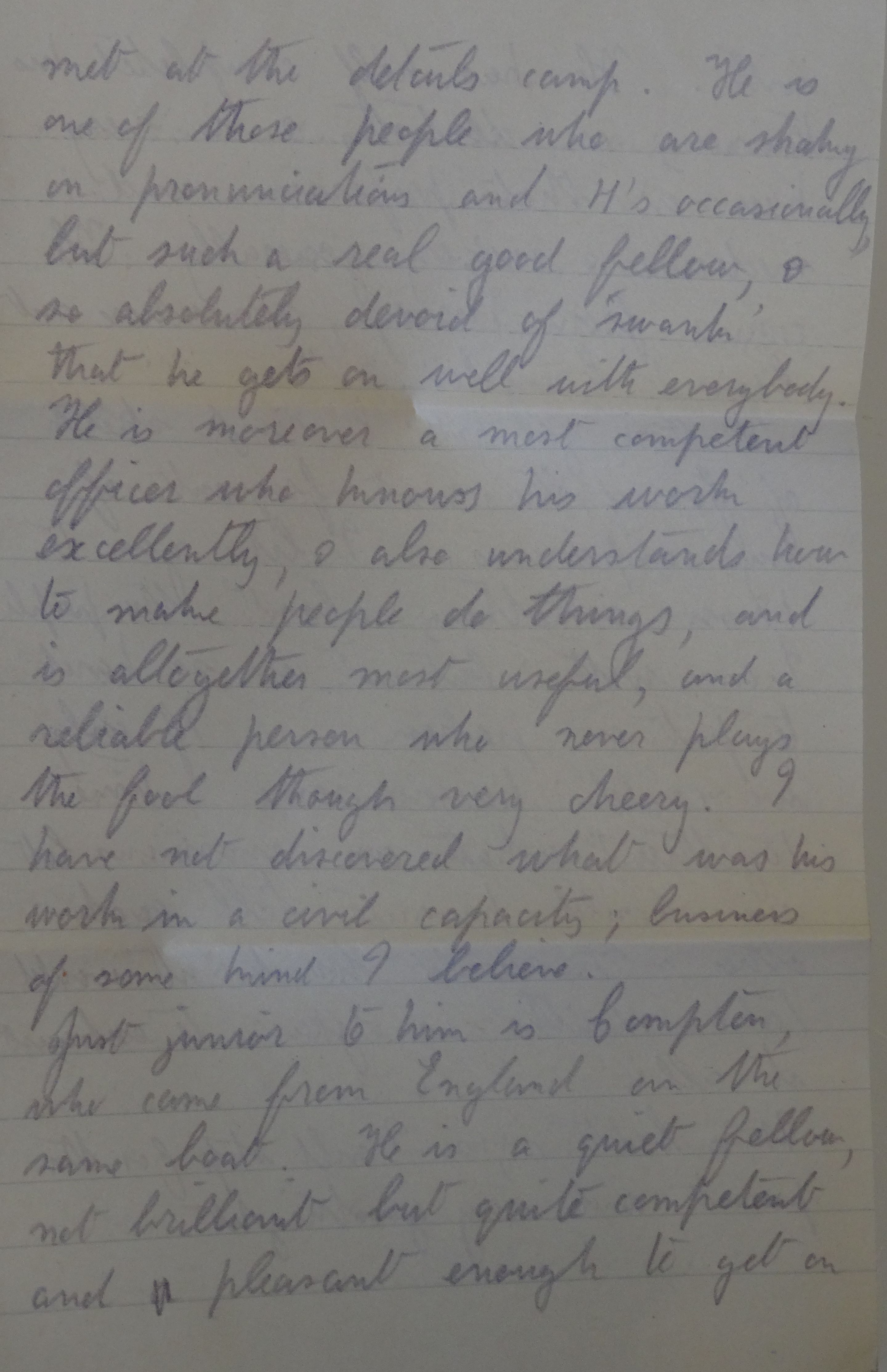 Just junior to him is Compton, who came from England on the same boat. He is a quiet fellow, not brilliant but quite competent and pleasant enough to get on with. He has half completed his training in dentistry and is very keen on that profession and medicine and surgery generally. He comes from Surrey, somewhere out beyond Croydon.