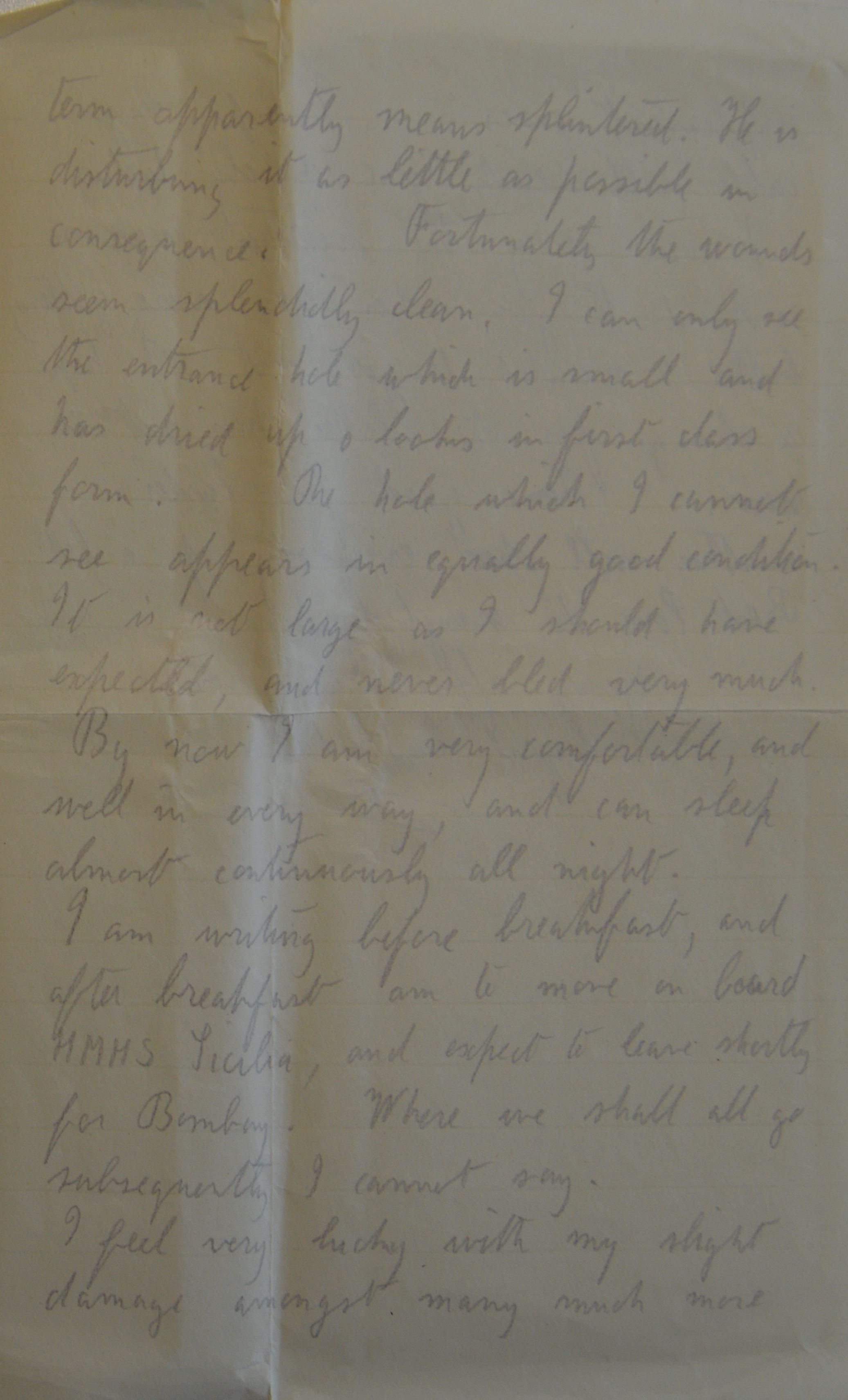 I am writing before breakfast, and after breakfast am to move on board HMS Sicilia, and expect to leave shortly for Bombay. Where we shall all go subsequently I cannot say.