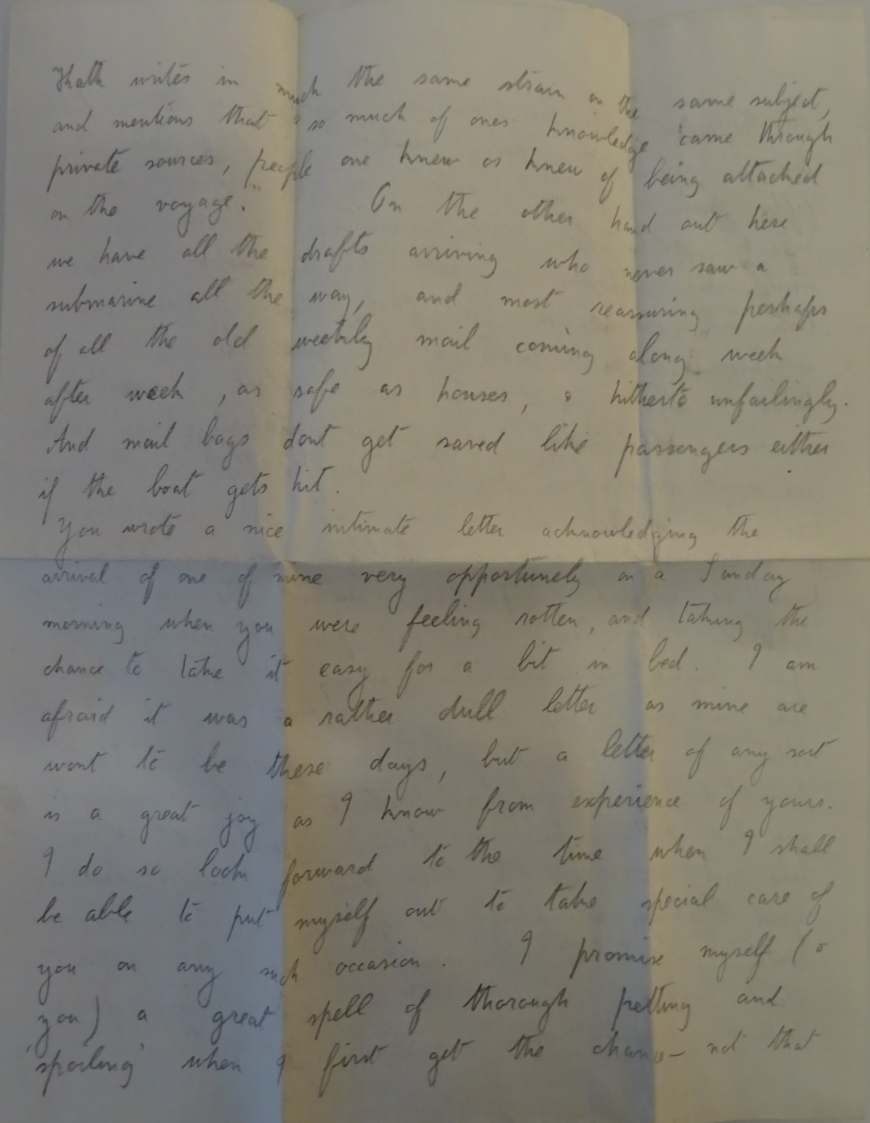 Kath writes in much the same strain on the same subject, and mentions that that so much of one’s knowledge came through private sources, people one knew or knew of being attacked on the voyage. On the other hand out here we have all the drafts arriving who never saw a submarine all the way, and most reassuring perhaps of all the old weekly mail coming along week after week, as safe as houses, and hitherto unfailingly. And mail bags don’t get saved like passengers either if the boat gets hit.