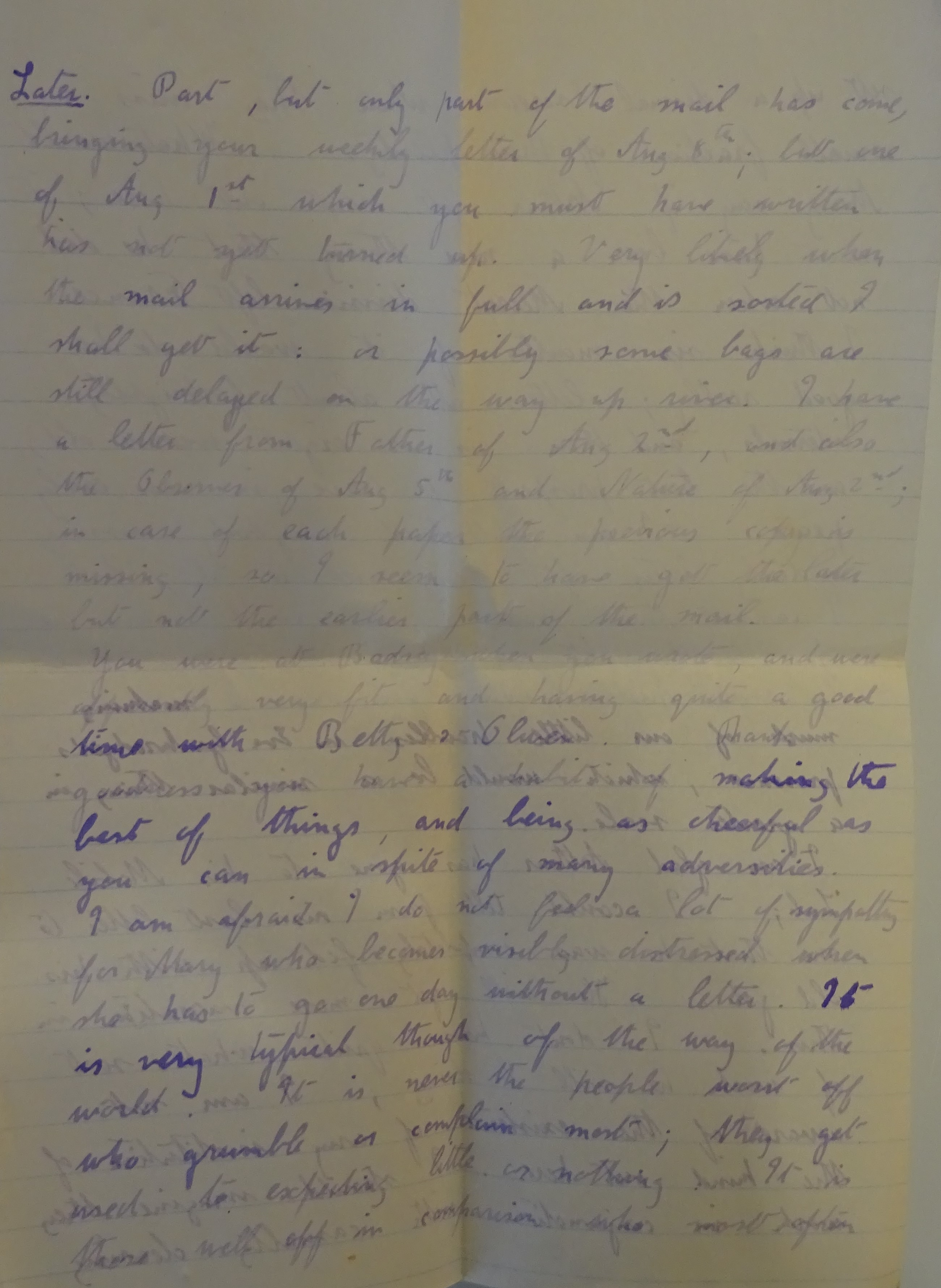 You were at Badsey when you wrote, and were apparently very fit and having quite a good time with Betty and Olwen thank goodness again and making the best of things, and being as cheerful as you can in spite of many adversities.