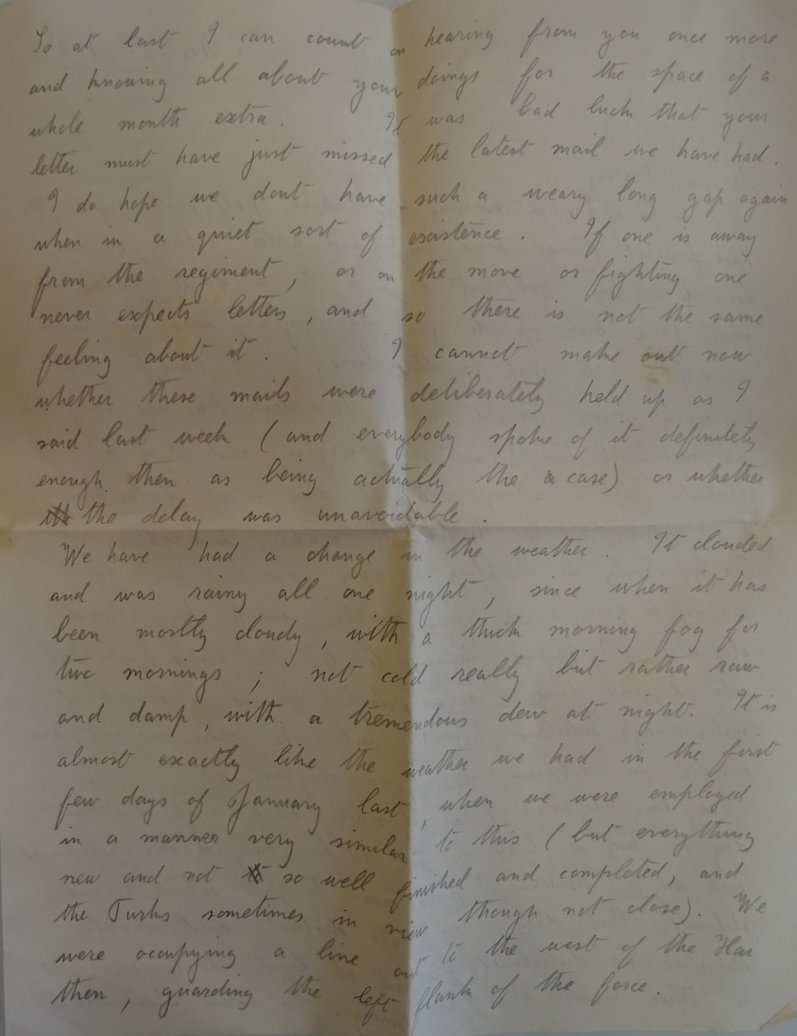 We have had a change in the weather. It clouded and was rainy all one night, since when it has been mostly cloudy, with a thick morning fog for two mornings; not cold really but rather raw and damp, with a tremendous dew at night. It is almost exactly like the weather we had in the first few days of January last, when we were employed in a manner very similar to this (but everything new and not so well finished and completed, and the Turks sometimes in view though not close). We were occupying a line out to the west of the Hai then, guarding the left flank of the force.
