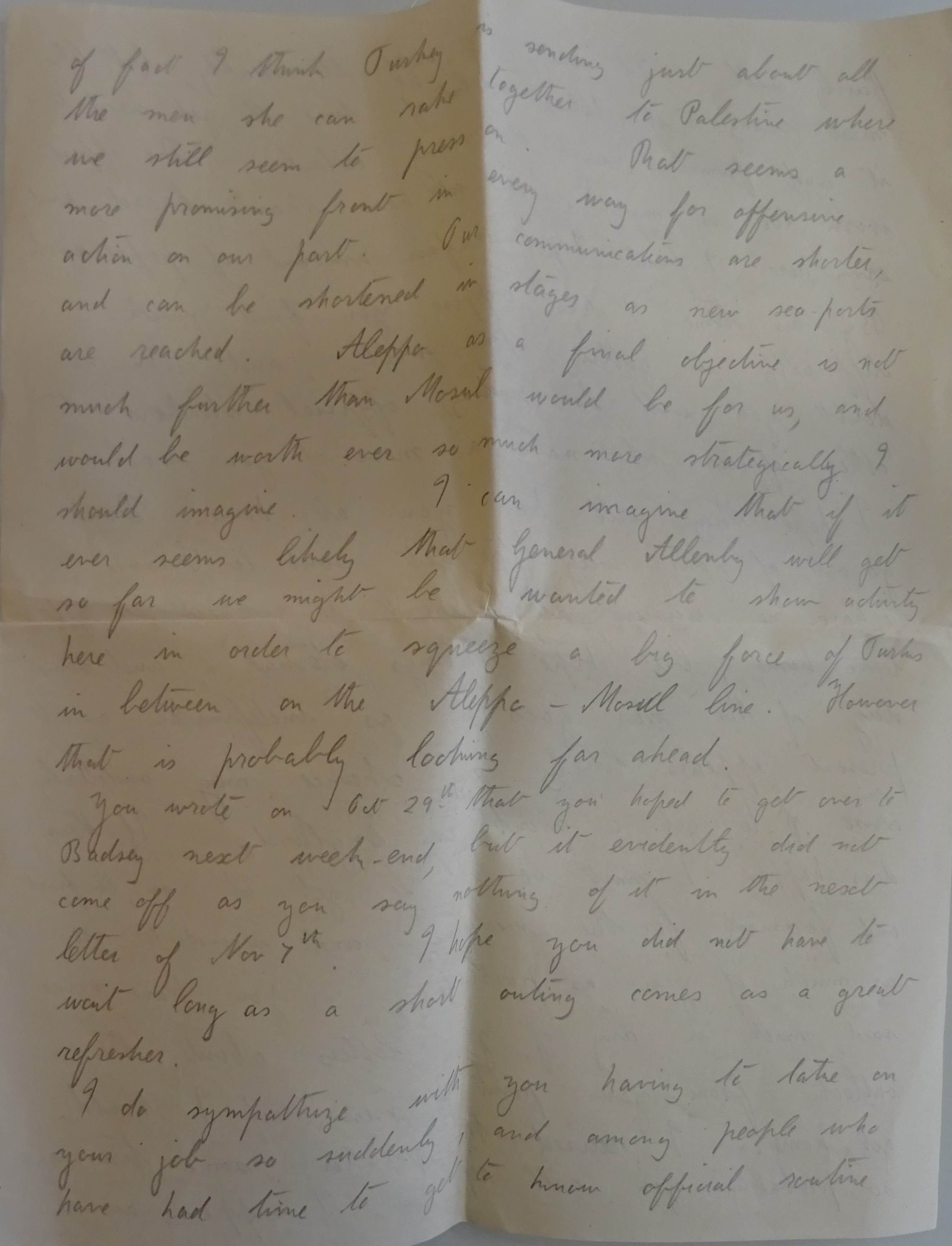 You were wondering in your letter of Oct 29th whether I had been having any more fighting to do. You know by my letters that we have been sitting in safety for months past. Whether (if ever) this front is likely to become very active again it is hard to say. I think if the enemy proposed to start much trouble before next hot weather we should have got some indications of it by this time. It is not much fun fighting in April out here, and one would not choose that month for preference. May verges on the impossible. That leaves two and a half months, during which the rain is likely to produce complete immobility for one or two short spells. Transport for the enemy is very slow of necessity, so if no big movement of troops is reported in the very near future I think any sort of attack here may be definitely counted as off. As a matter of fact I think Turkey is sending just about all the men she can rake together to Palestine where we still seem to press on. That seems a more promising front in every way for offensive action on our part. Our communications are shorter, and can be shortened in stages as new sea ports are reached. Aleppo as a final objective is not much farther than Mosul would be for us, and would be worth ever so much more strategically I should imagine. I can imagine that if it ever seems likely that General Allenby will get so far we might be wanted to show activity here in order to squeeze a big force of Turks in between on the Aleppo-Mosul line. However that is probably looking far ahead.