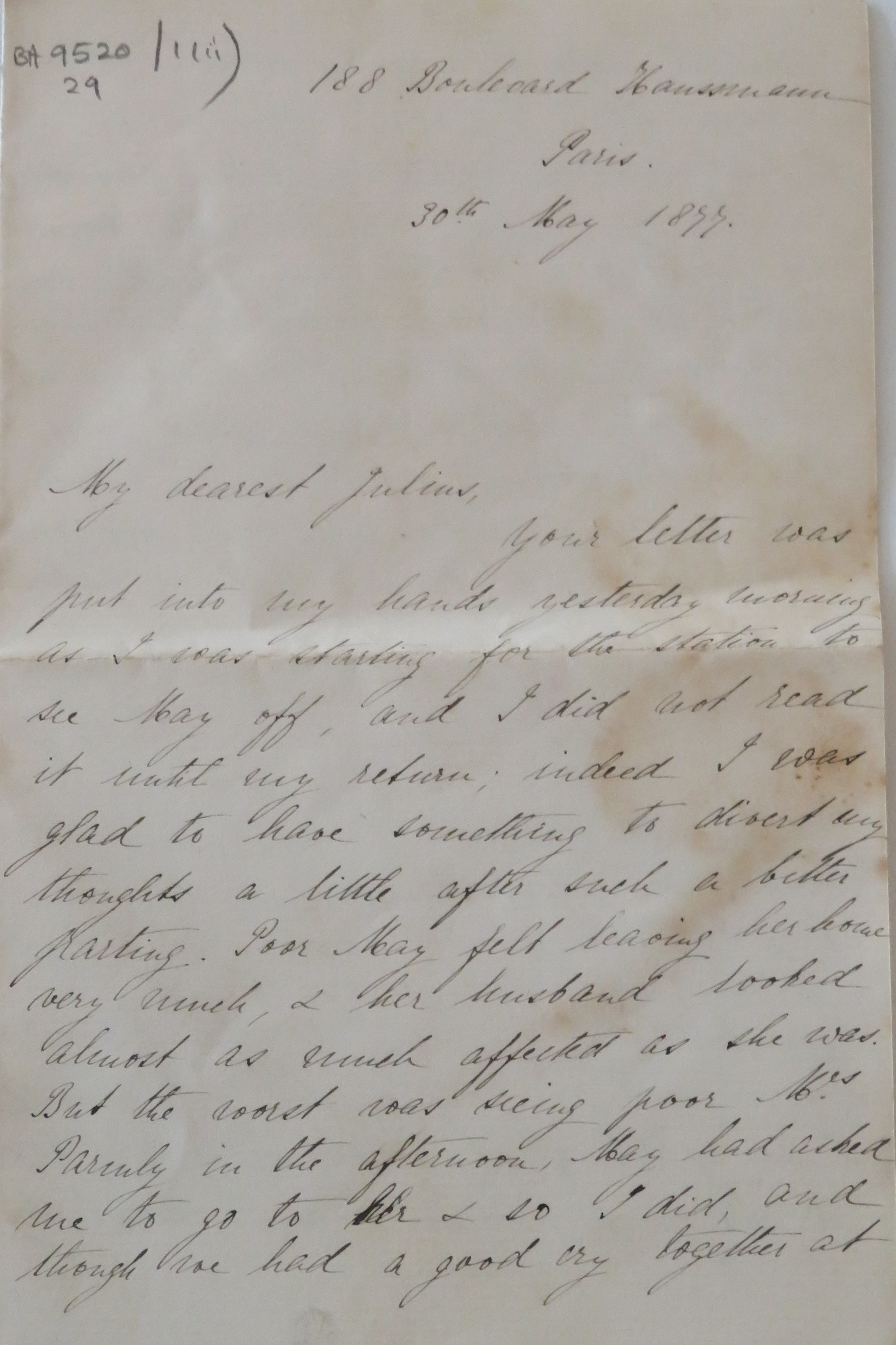 Your letter was put into my hands yesterday as I was starting for the station to see May off and I did not read it until my return; indeed I was glad to have something to divert my thoughts a little after such a bitter parting. Poor May felt leaving her home very much & her husband looked almost as affected as she was. But worst was seeing poor Mrs Parmly in the afternoon; May had asked me to go to her & I did, & though we had a good cry together at first, I hope my going there rather cheered her.