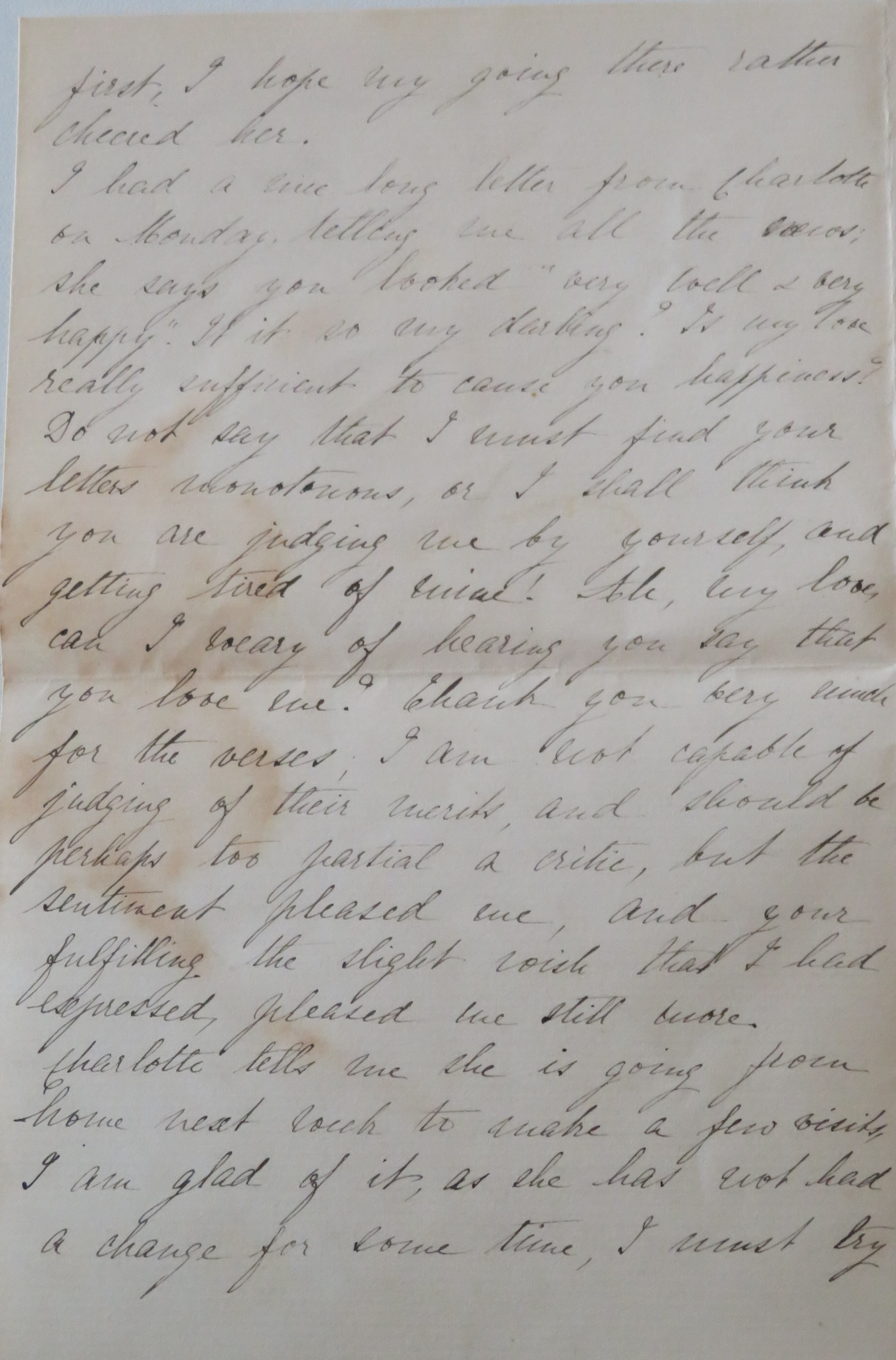 I had a long letter from Charlotte on Monday, telling me all the news, she says you looked very well & very happy. If it is so my darling, is my love really sufficient to cause you happiness? Do not say that I must find your letter monotonous as I shall think you are judging me by yourself, and getting tired of mine! Ah, my love, can I weary of hearing you say that you love me? Thank you very much for the verses. I am not capable of judging of their merits and would perhaps be too partial a critic but the sentiment pleased me, and your fulfilling the slight wish that I expressed, pleased me still more.