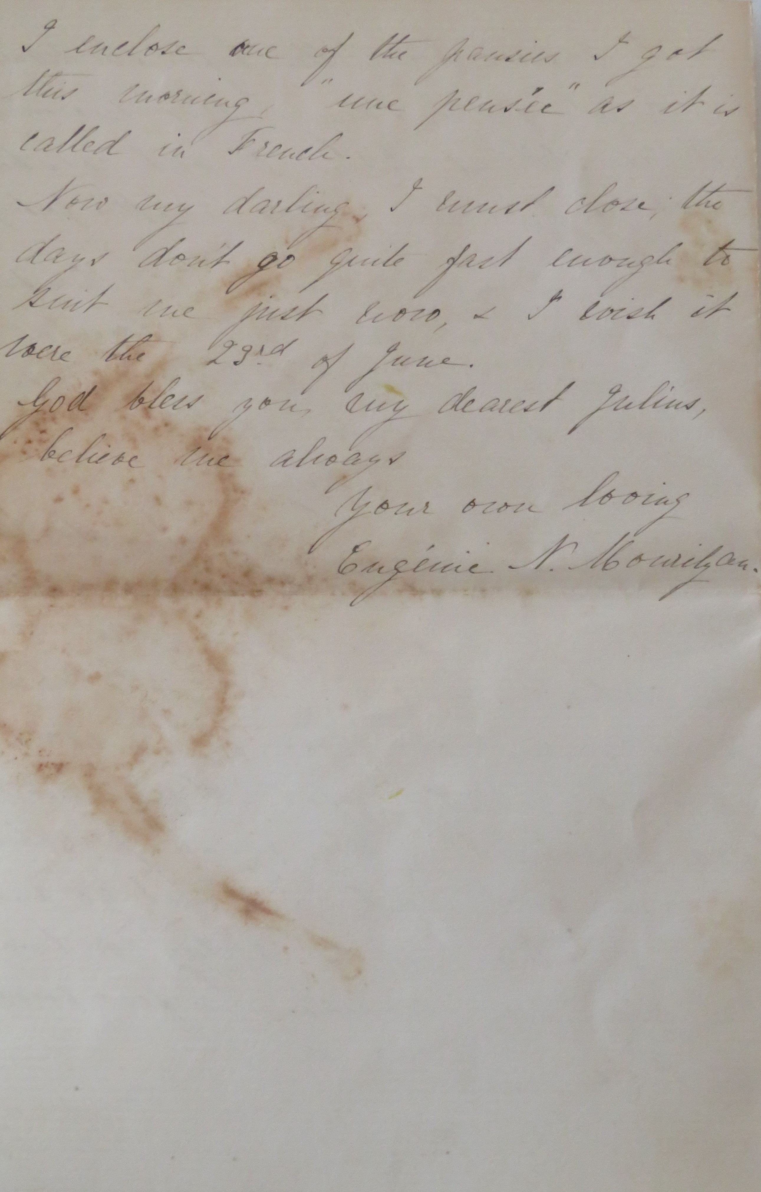 The clouds have returned after three fine days, it is only showery however & quite warm. I was out this morning buying a few plants at the flower market for our balcony. Joe has been going on so long for its bare appearance that I thought it quite time to get a few. I also went to the service & met Mr Johnson, a clergyman who was at Marbeuf for six months before Mr Mansell was appointed & the finest preacher I have ever heard. I must go and call on his wife in a day or two as they are remaining a few weeks in Paris. I enclose one of the pansies I got this morning, une pansée as it is called in French.