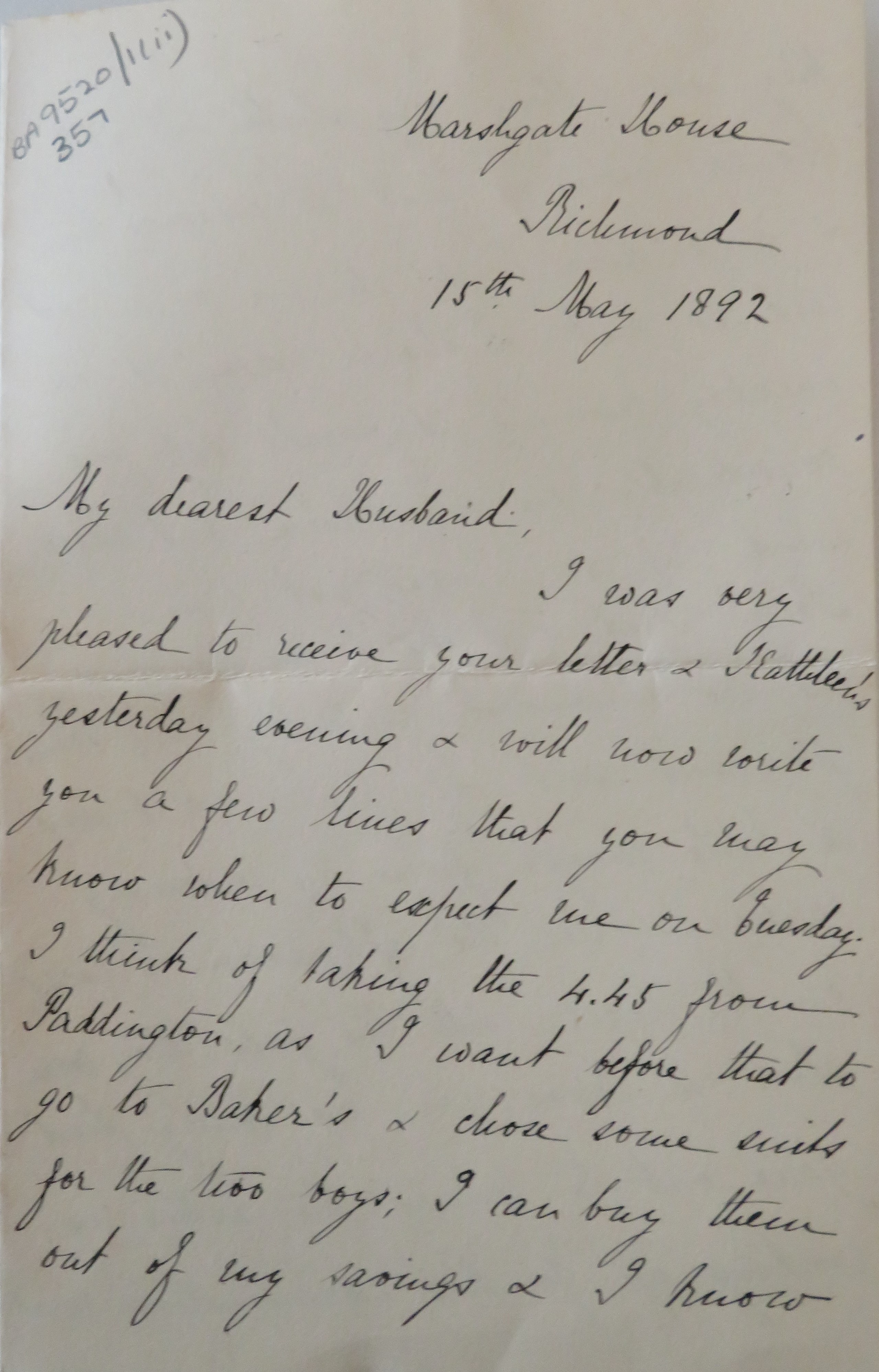 I was very pleased to receive your letter & Kathleen’s yesterday evening & will now write you a few lines that you may know when to expect me on Tuesday. I think of taking the 4.45 from Paddington, as I want before that to go to Baker’s & chose some suits for the two boys; I can buy them out of my savings & I know they are getting very shabby. If you could manage just to measure them & send their height to me on a post card, so that I should receive it on Tuesday morning, it would help me considerably in my choice, but never mind if you have not time.