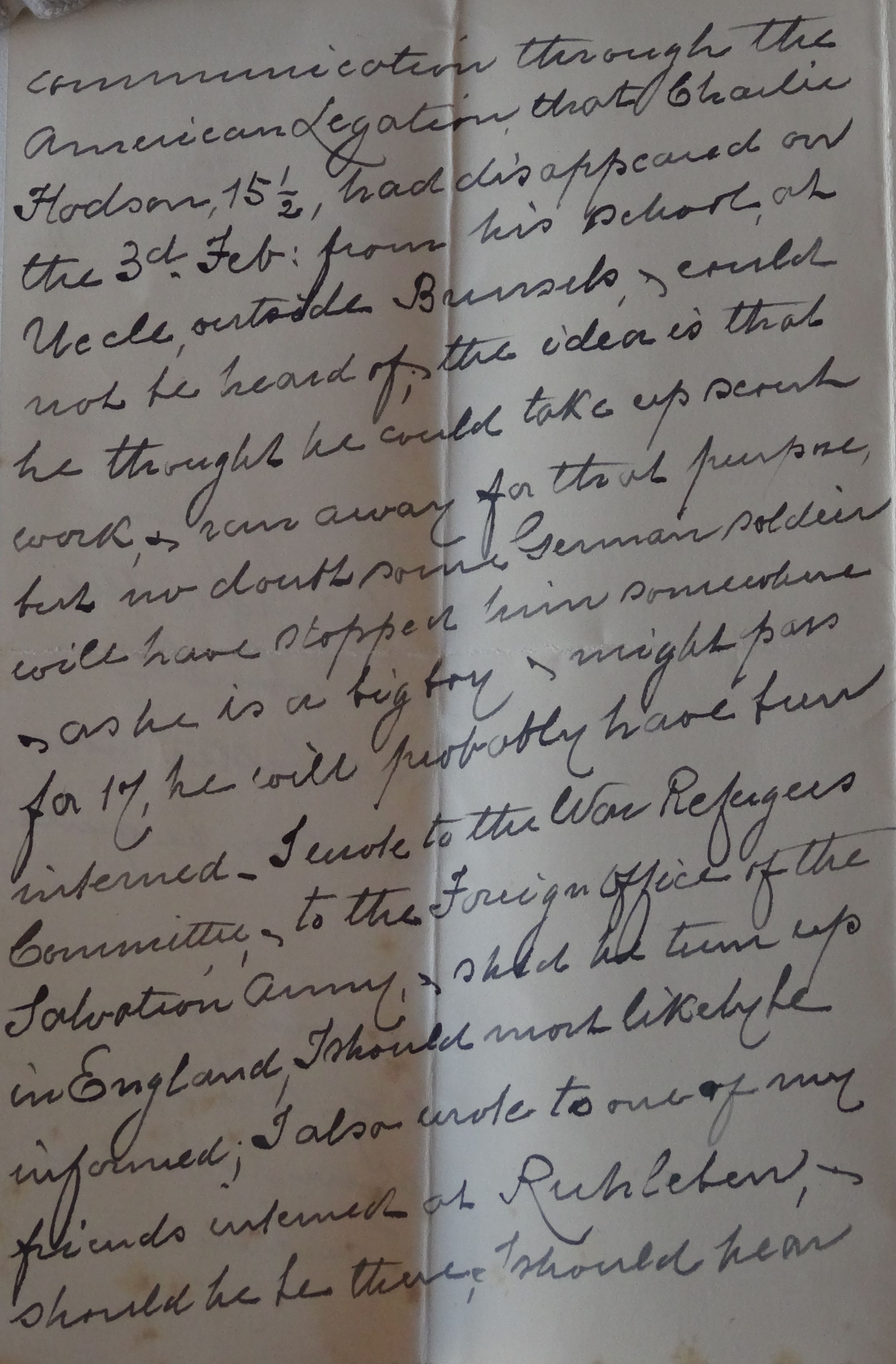 Annie Hodson appears to have no end of trouble with her children. About a fortnight ago I received a communication through the American Legation that Charlie Hodson, 15½, had disappeared on 3rd February from his school at Uccle outside Brussels, could not be heard of; the idea is that he thought he could take up scrub work, ran away for that purpose, but no doubt some German soldier will have stopped him somewhere as he is a big boy and might pass for 17, he will probably have him interned. I wrote to the War Refugees Committee, to the Foreign Office of the Salvation Army and should he turn up in England, I should most likely be informed. I also wrote to one of my friends interned at Ruhleben, should he be there, I should hear some time or other. I quite expect he will be all right somewhere. I had a letter from Annie dated 31st January. I managed to send her some money through the American Legation at The Hague; they seem to be getting on somehow.