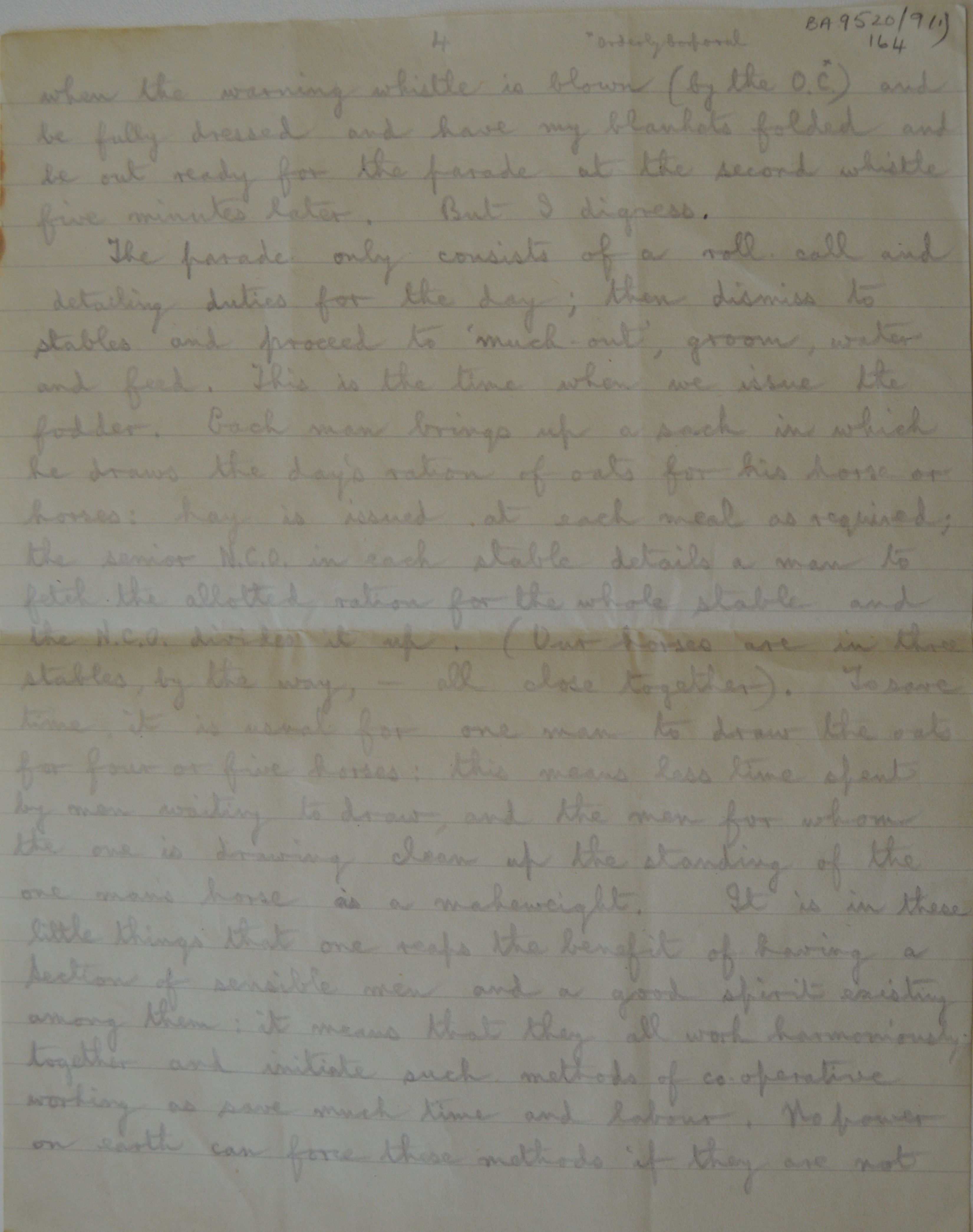 Reveille is at 6 am, though there is little or no light till about 7; in fact I shall see the officer in a few days with regard to putting it later. One of the two men on stable picquet comes round and wakes everybody starting with the Cook and the Orderly troopers and finishing with me. Yes, it is true that I don't like early rising any more than I did. It is usual in the Army, as in everyday life, to share and wash directly after rising. But as the effect of washing is wholly destroyed if it is followed by cleaning stables and grooming the night's mud off a horse (it is a marvel how dirty nine horses out of ten make themselves every night) we leave these toilet operations till later. I have therefore arrived at a great proficiency in swift dressing; I can arise when the warning whistle is blown (by the OC - Orderly Corporal), be fully dressed and have my blankets folded and be out ready for the parade at the second whistle five minutes later. But I digress.