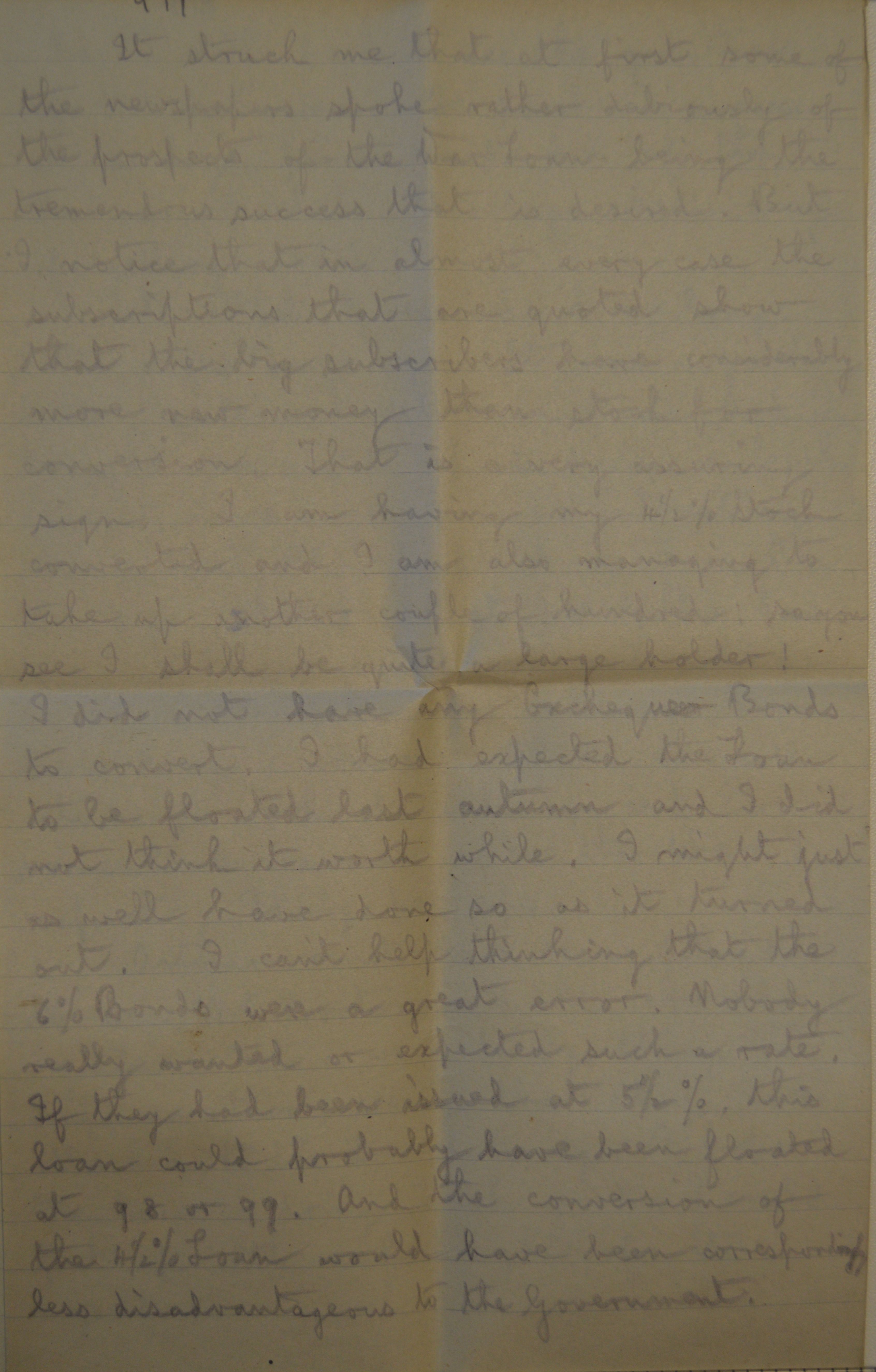 It struck me that at first some of the newspapers spoke rather dubiously of the prospects of the War from being the tremendous success that is desired. But I noticed that in almost every case the subscriptions that are quoted show that the big subscribers have considerably more new money than stock for conversion. That is a very assuring sign. I am having my 4½% stock converted and I am also managing to take up another couple of hundred: so you see I shall be quite a large holder! I did not have my Exchequer Bonds to convert. I had expected the loan to be floated last autumn and I did not think it worthwhile. I might just as well have done so as it turned out. I can’t help thinking that the 6% bonds were a great error. Nobody really wanted or expected such a rate. If they had been issued at 5½%, this loan could probably have been floated at 98 or 99. And the conversion of the 4½% loan would have been correspondingly less advantageous to the Government. No, I still fail to see the greatness of Mr McKenna. He purchased success at a high price paid out of the Nation’s pocket. A very cheap way of getting credit!