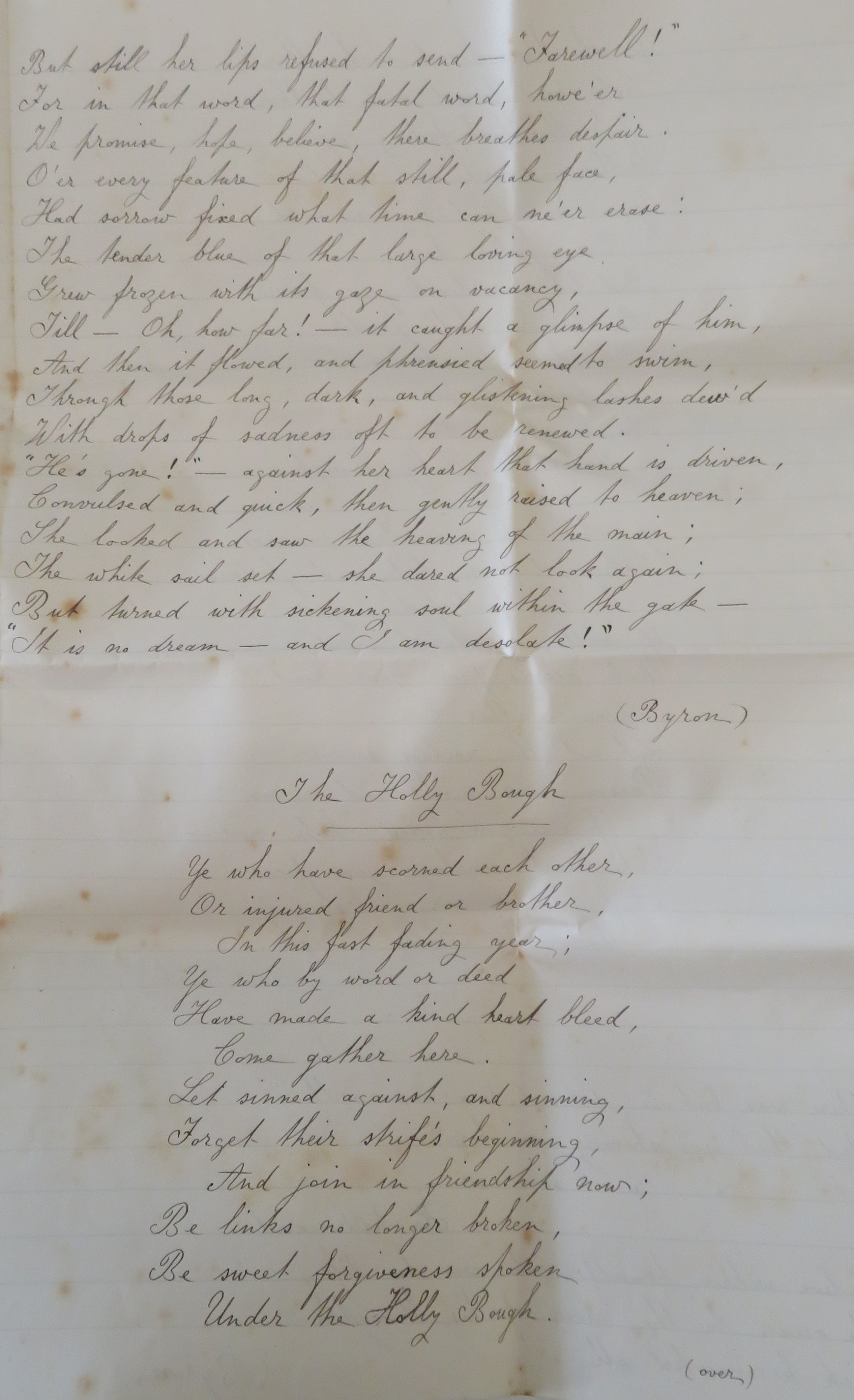 Perhaps you may be interested to know that once upon a time I tried very hard to get a printed copy of the lines “Forget thee!” to send with your handkerchief, for I have seen them sold as a valentine, however I was unable, and could not write them out as you would have known my writing, and you know – don’t smile dearest – the valentine was sent anonymously! The lines by Byron “The parting of Conrad & Medora” are, I consider, magnificent but I expect you have read “the Corsair” in which they occur. I rather imagine you will like the “Holly Bough” it is certainly a very pretty little lyric.