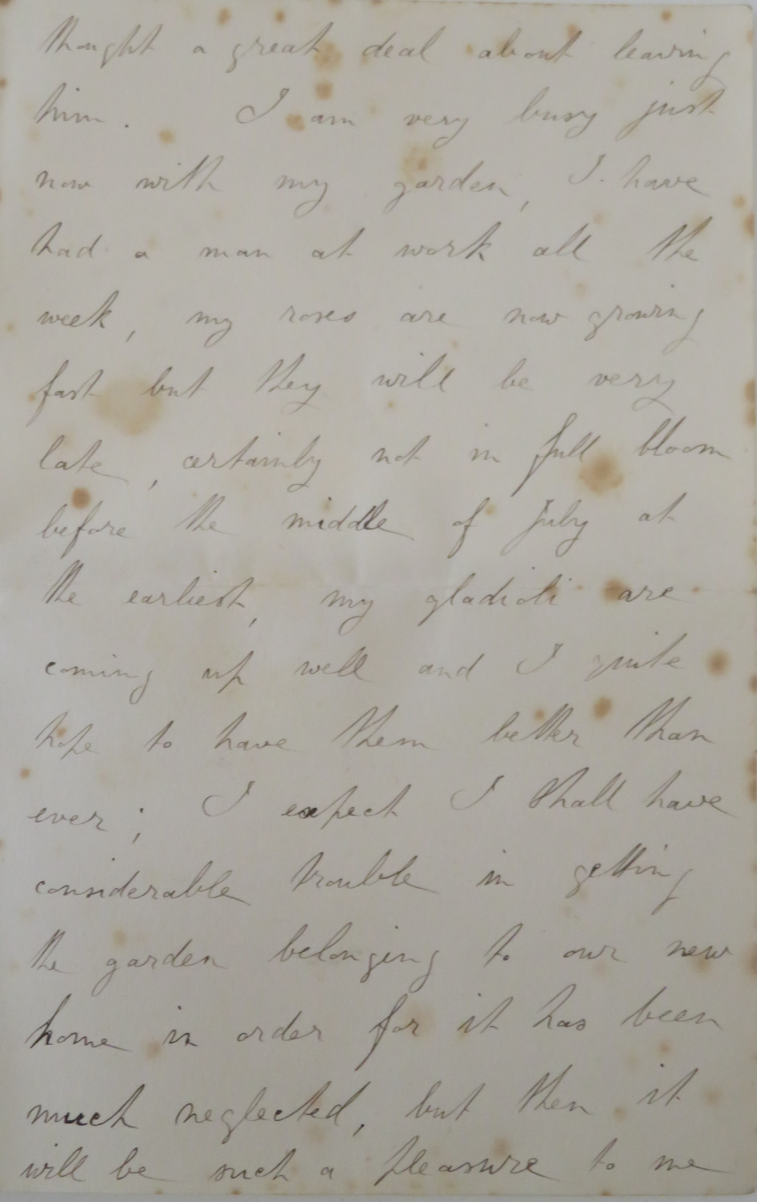 I am very busy just now with my garden, I have had a man at work all the week, my roses are now growing fast but they will be very late, certainly not in full bloom before the middle of July at the earliest, my gladioli are coming up well and I quite hope to have them better than ever; I expect I shall have considerable trouble in getting the garden belonging to our new home in order for it has been much neglected, but then it will be such a pleasure to me getting that home ready for I shall feel that I am doing it all to try and make my own darling Eugénie happy and comfortable.