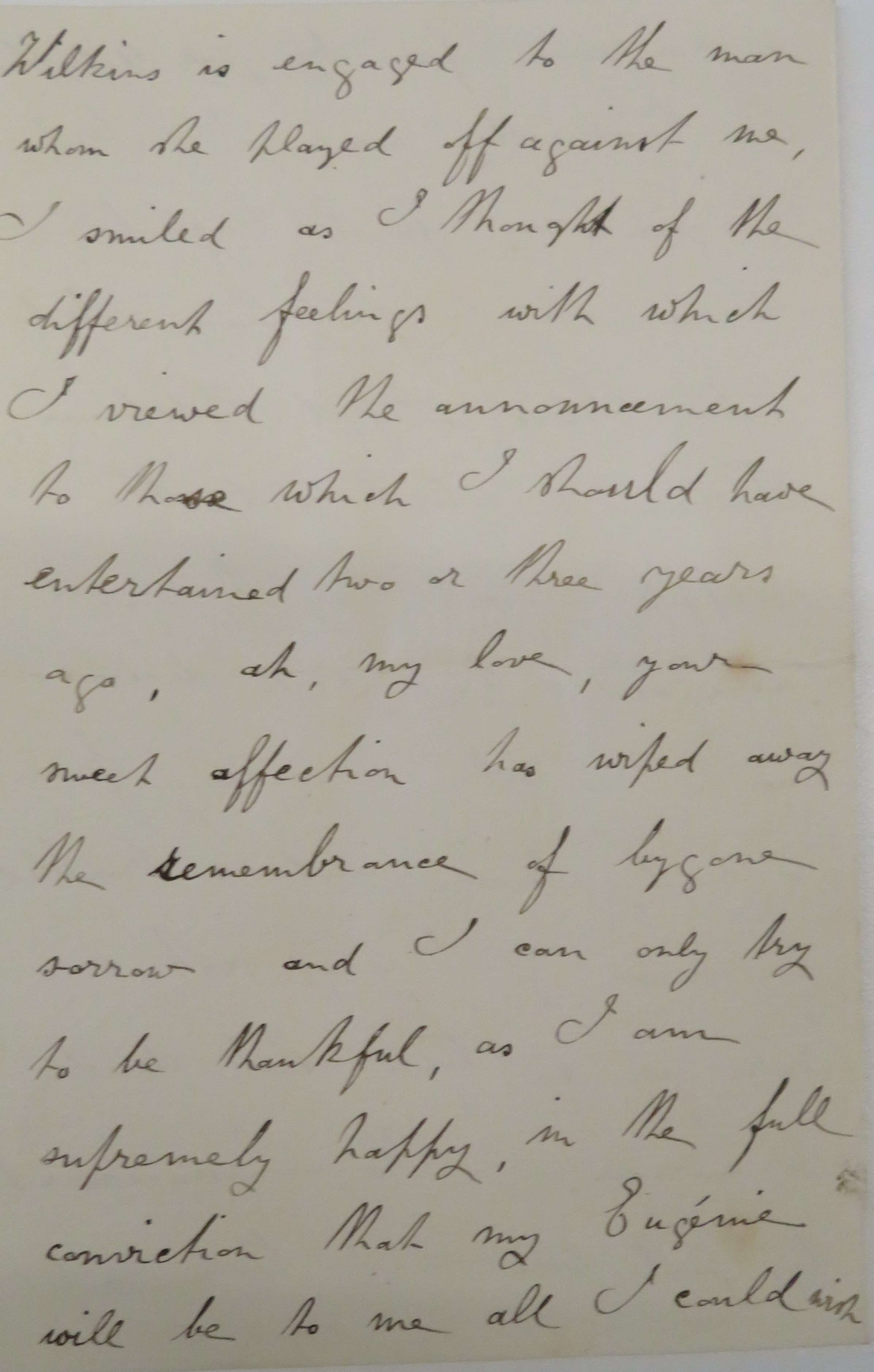 The announcement has just been made that Miss Wilkins is engaged to the man whom she played off against me, I smiled as I thought of the different feelings with which I viewed the announcement to those which I should have entertained two or three years ago, ah, my love, your sweet affection has wiped away the remembrance of bygone sorrow and I can only try to be thankful, as I am supremely happy, in the full conviction that my Eugénie will be to me all I could wish and more than I deserve; when I loved before I always felt, though perhaps tried to drown, a lurking want of faith, but I have lived to find a more perfect love, you, my own darling, have won that full trust which I know so well is the mainspring of a happy marriage, and I think I am right in feeling, as I always do, that my Eugénie has all the confidence in me that every true hearted woman should have in the man she loves!