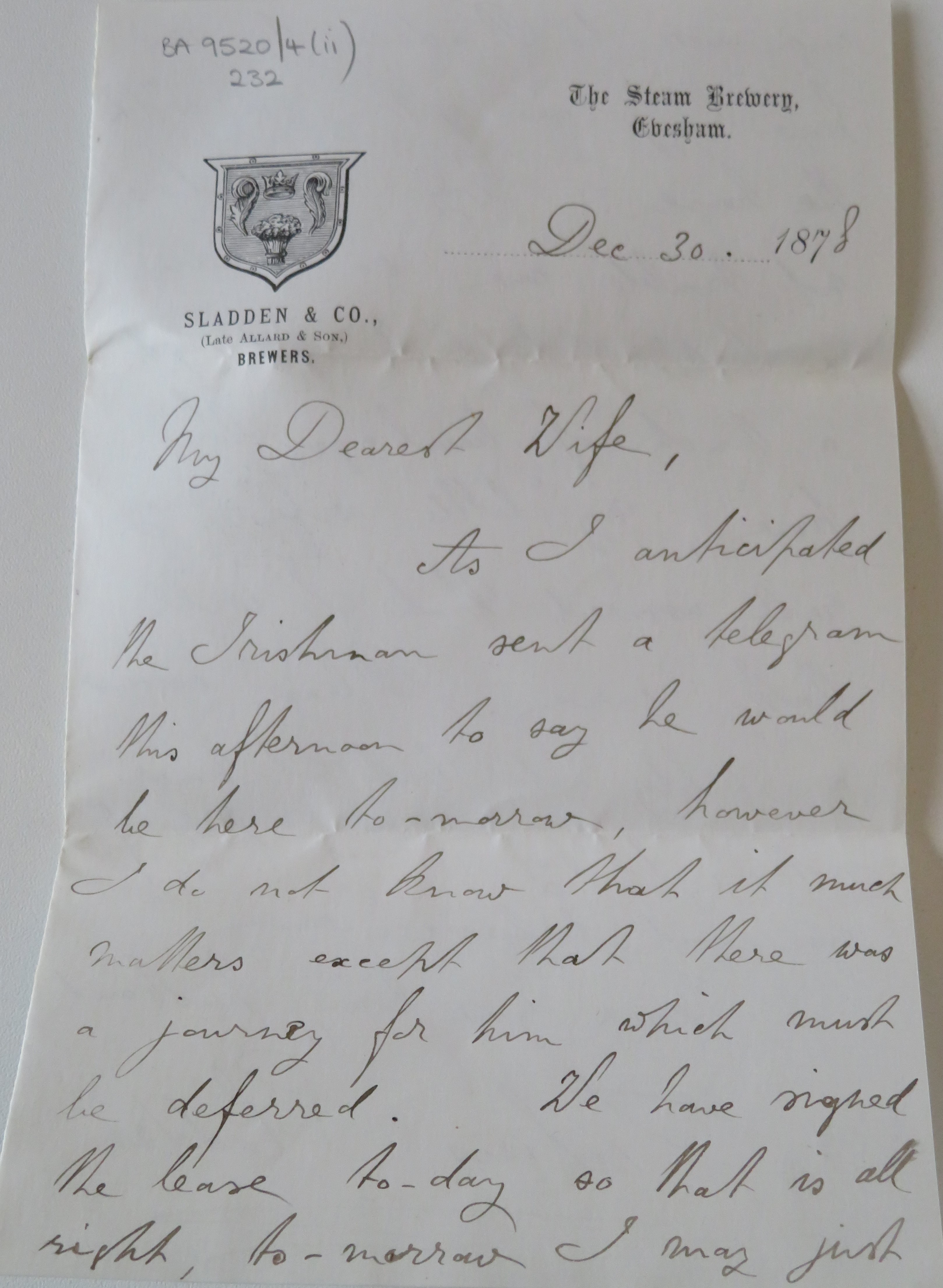 Envelope containing 1 double sheet of headed notepaper for The Steam Brewery, Evesham, with coat of arms saying Sladden & Co (late Allard & Son), Brewers