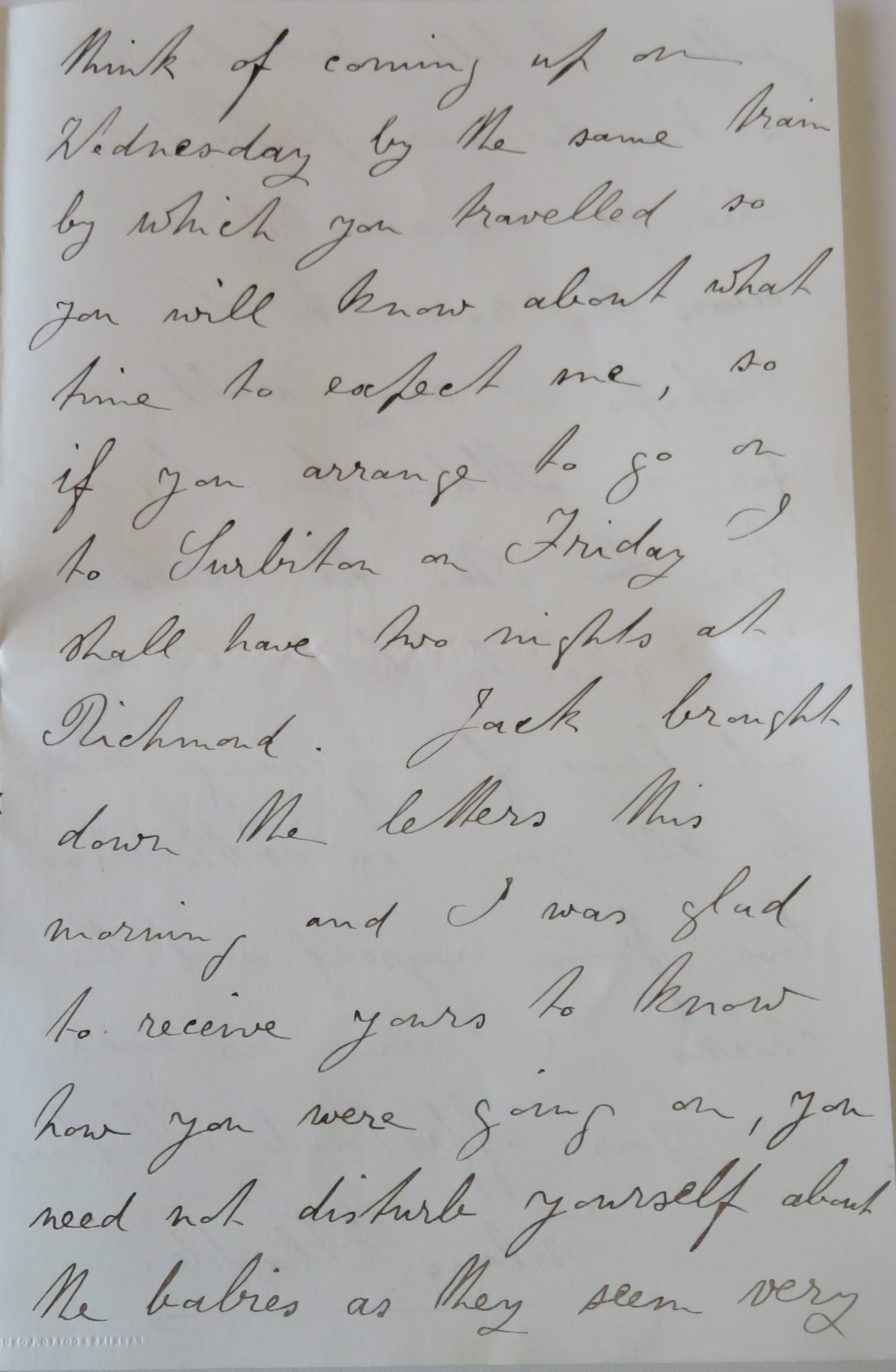 The little ones are very well and very happy they have just been with me for half an hour after dinner and were very good indeed, they both gave kisses to be sent to Mamma, yesterday I hear Mrs Savory called when they were out and left word that they were to go to tea on Tuesday. We went shooting yesterday but did not do much, however it was fine, Haynes asked me to stop and dine so I did not get home till late. I think of coming up on Wednesday by the same train by which you travelled so you will know about what time to expect me, so if you arrange to go on to Surbiton on Friday I shall have two nights at Richmond. Jack brought down the letters this morning and I was glad to receive yours to know how you were going on, you need not disturb yourself about the babies as they seem very jolly, I told Jack to blow a kiss to your portrait to-day which he immediately ran across the room to do.