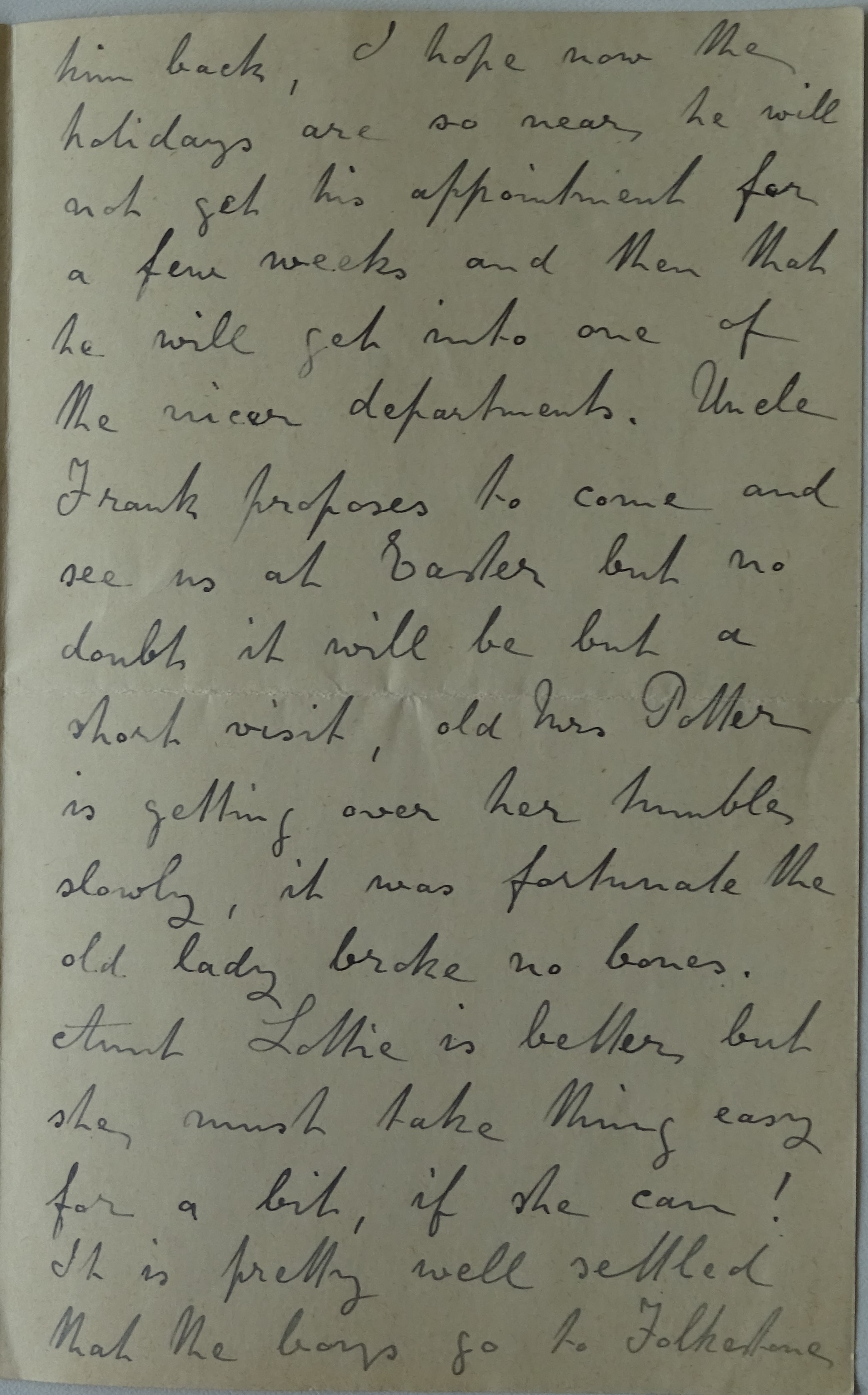 Uncle Frank proposes to come and see us at Easter but no doubt it will be but a short visit, old Mrs Potter is getting over her tumble slowly, it was fortunate the old lady broke no bones.