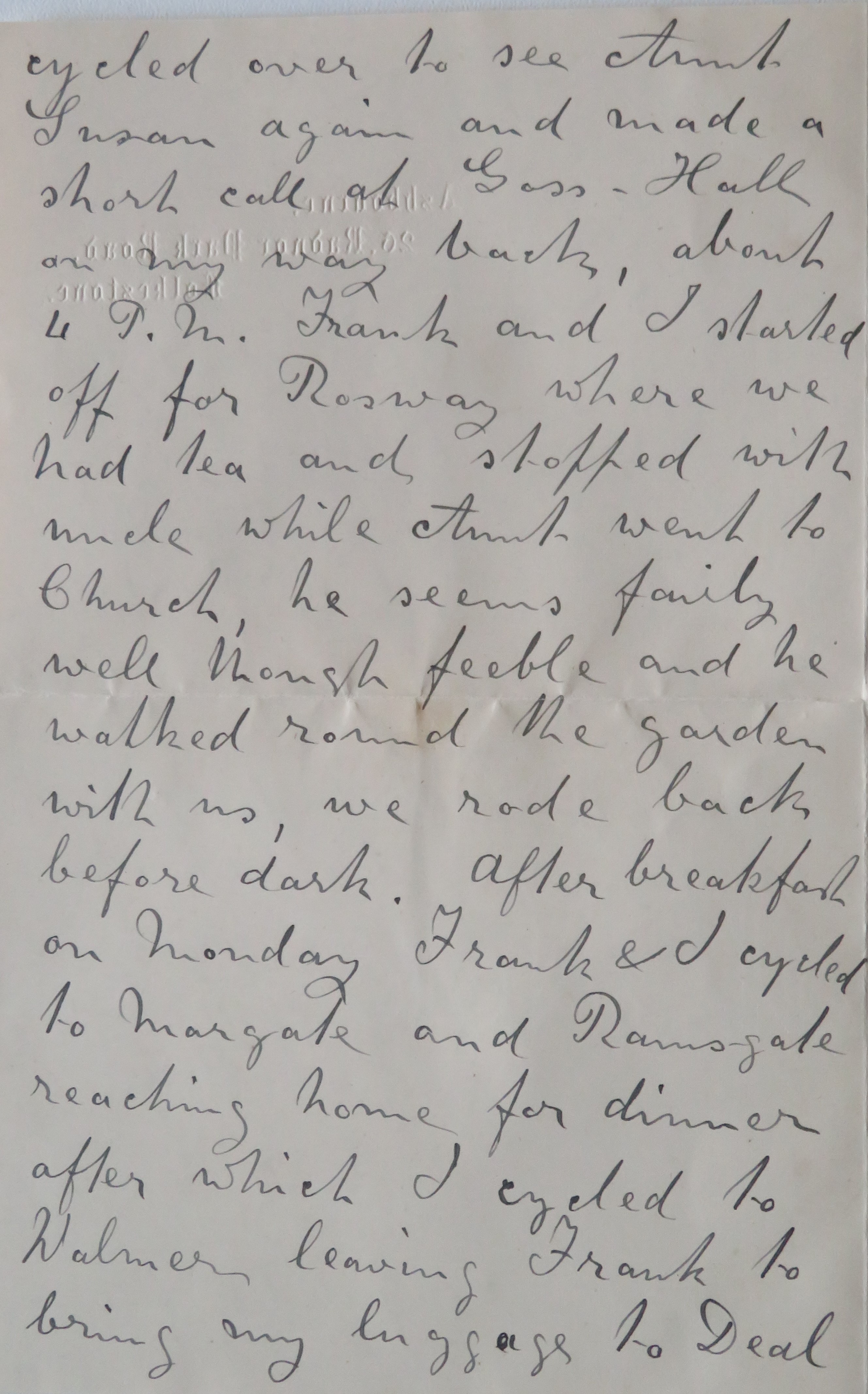 Taking up my narrative from my last letter, I went to St Peter’s Church in the morning with Frank and Edith, then immediately after dinner cycled over to see Aunt Susan again and made a short call at Goss-Hall on my way back, about 4 P.M. Frank and I started off for Rosway where we had tea and stopped with uncle while Aunt went to Church, he seems fairly well though feeble and he walked round the garden with us, we rode back before dark. After breakfast on Monday Frank & I cycled to Margate and Ramsgate reaching home for dinner after which I cycled to Walmer leaving Frank to bring my luggage to Deal, meet me at Rosway and take the cycle back, upon which I had done during the three days over 60 miles.