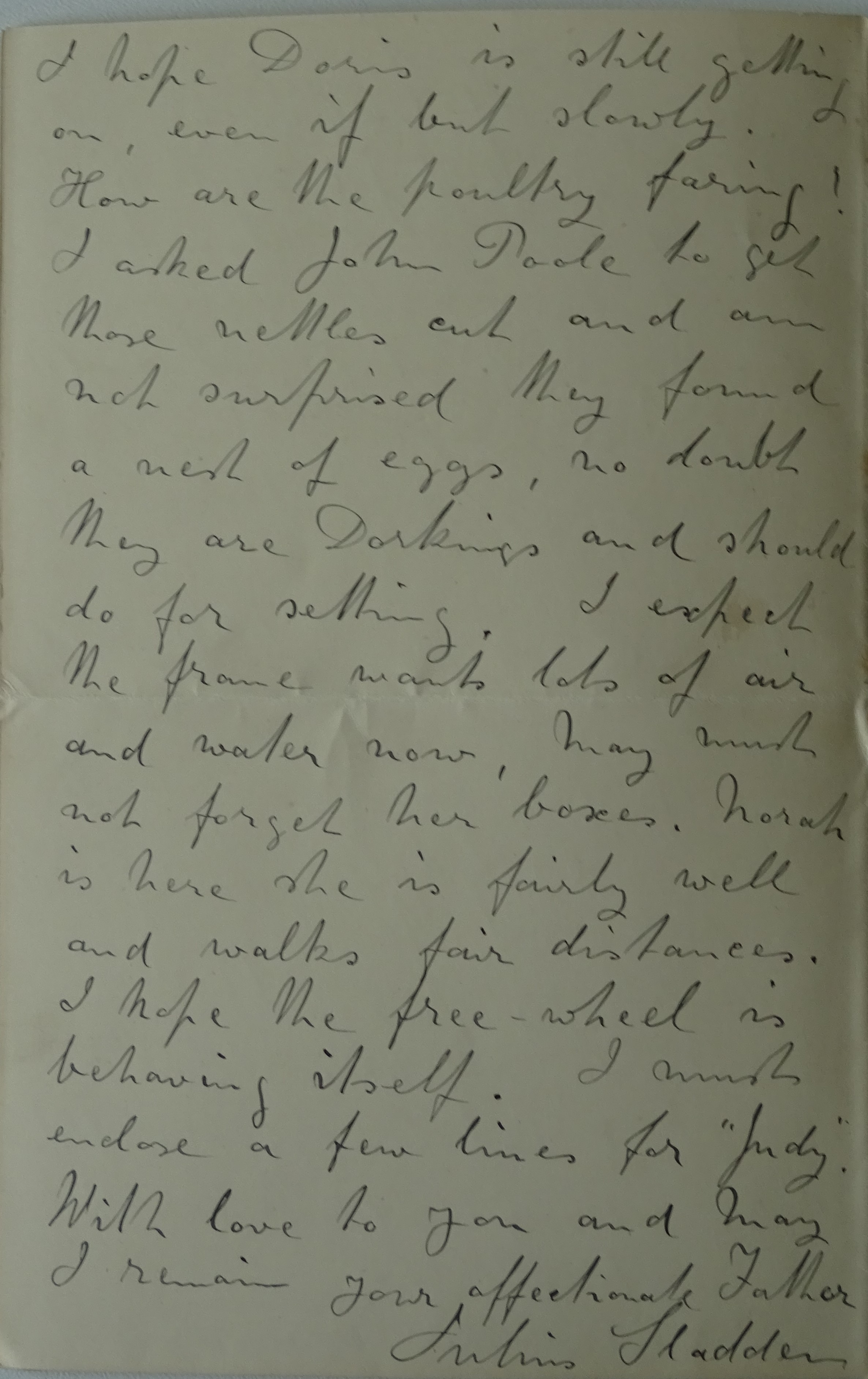 How are the poultry faring! I asked John Poole to get those nettles cut and am not surprised they found a nest of eggs, no doubt they are Dorkings and should do for setting. I expect the frame wants lots of air and water now, May must not forget her boxes.