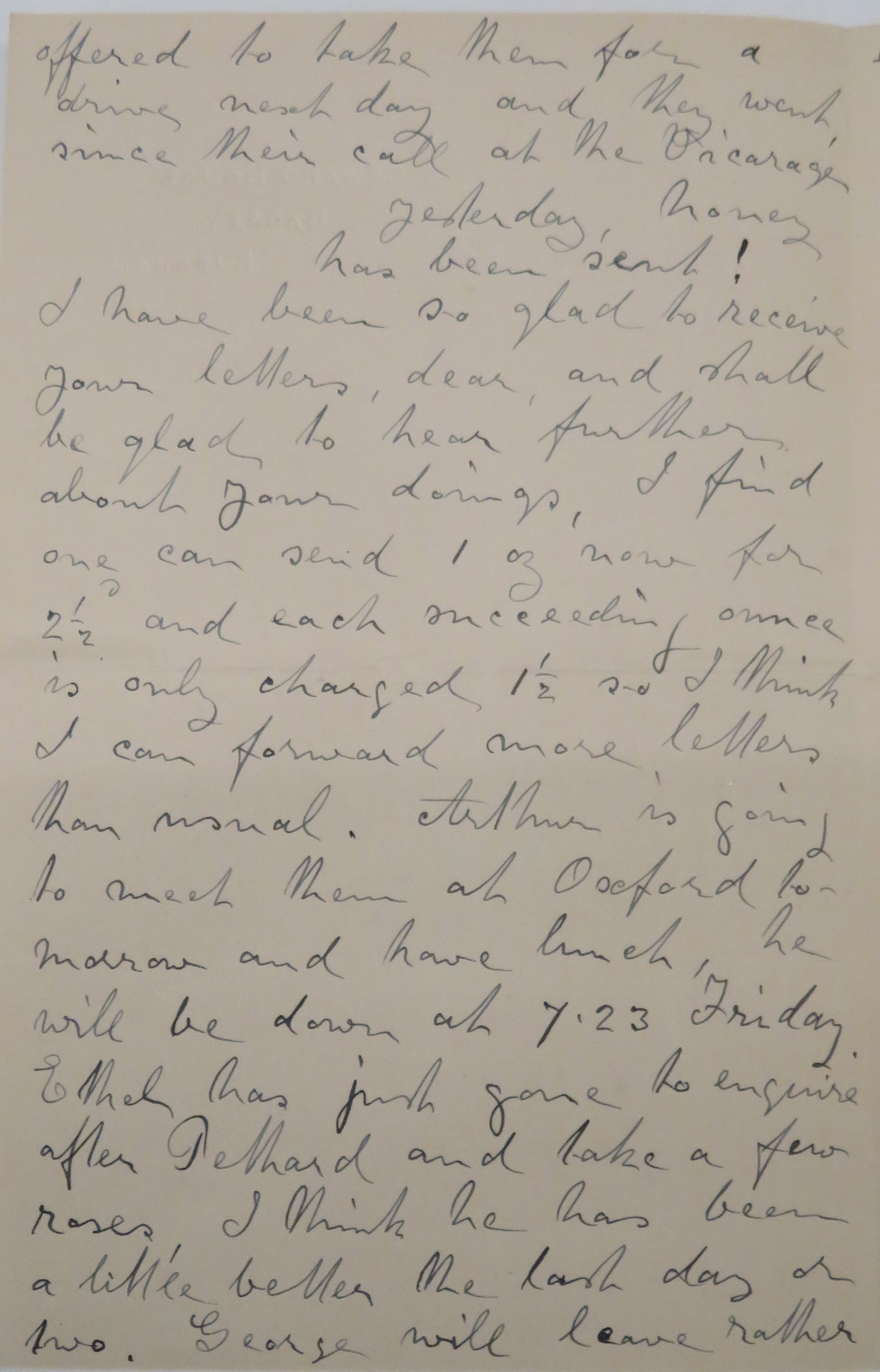 I have been so glad to receive your letters, dear and shall be glad to hear further about your doings, I find one can send 1oz now for 2½d and each succeeding ounce is only charged 1½ so I think I can forward more letters than usual.