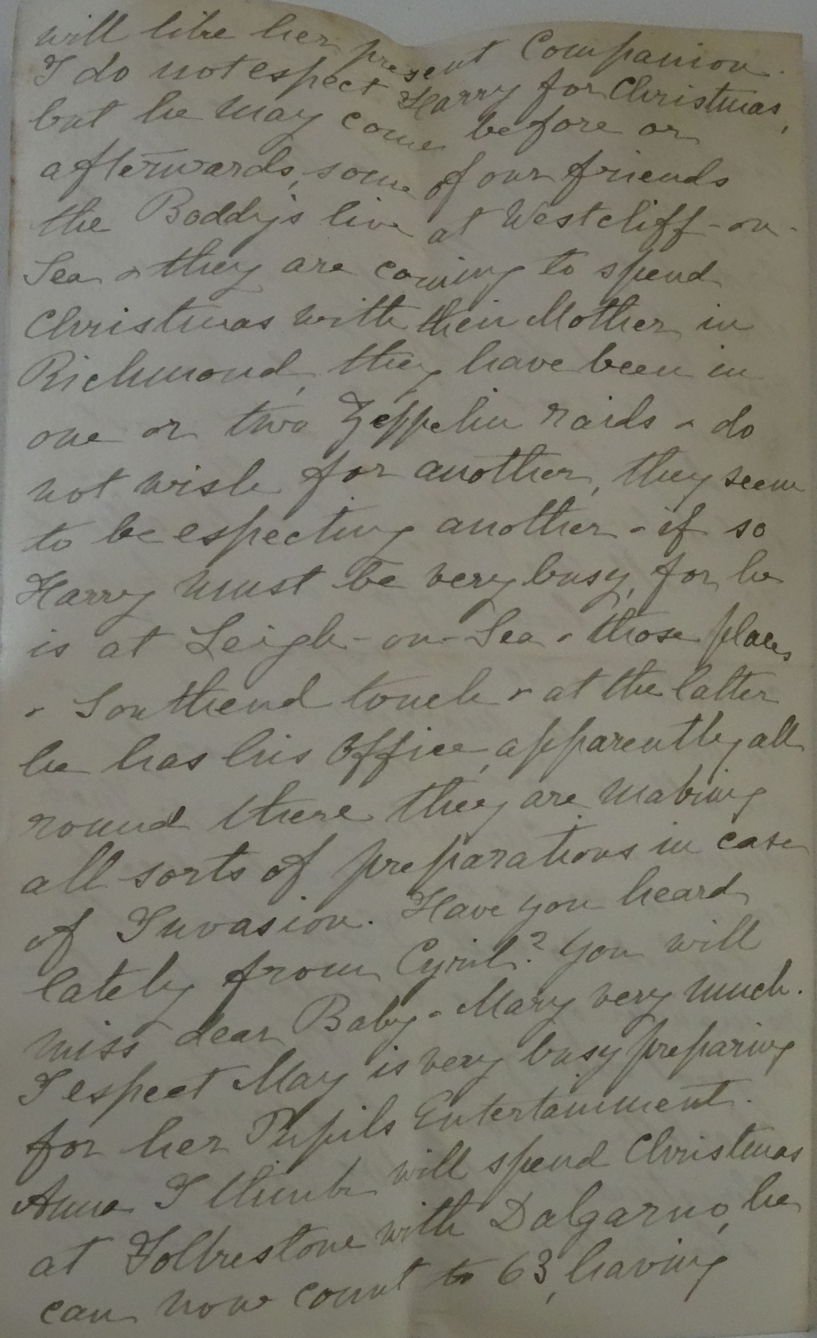 Thank you for both your letters with all the interesting news. I wish you and Julius many very happy returns of tomorrow your wedding day and I congratulate you both on George’s engagement and the prospect of yet another daughter-in-law. I thought it so very nice of him to write and tell me about it himself. I hope he may be kept in safety during this terrible war and later on have a very happy married life. I enclose a postal order for 10 shillings for a little present for your wedding day. I hope Julius’ cold will soon depart but the sudden changes in the weather make it difficult to get rid of them. I am so glad you are keeping better but you must not do too much, and yet you must be much tempted when there is so much to do. I hope your maid is well again now. I had a very long letter from Mary this morning, they have invited Colonel and Mrs Burrows, Aunt Emily and Miss Lobb to dine with them on Christmas Day and the latter to spend the weekend with them. Ted is better and was able to go to church last Sunday and is very much enjoying a book called “The Ordeal of Battle”. I gave it to Mary for a birthday present and read a good deal of it one Sunday when I was alone before sending it on and found it most interesting. Edwin is getting on so well that he is to be allowed to come home for a week at Christmas, so we expect him to arrive tomorrow week. We are all to join their early dinner on Christmas Day. Jack came to see us on Sunday week and looked so well. I am sure the remainder of his holiday did him a great deal of good. I am glad Charlotte is going to spend Christmas with Mrs Fellows, she will enjoy that. I hope C will like her present companion. I do not expect Harry for Christmas, but he may come before or afterwards. Some of our friends, the Boddys, live at Westcliff-on-Sea and they are coming to spend Christmas with their Mother in Richmond, they have been in one or two Zeppelin raids and do not wish for another, they seem to be expecting another. If so, Harry must be very busy for he is at Leigh-on-Sea and those places and Southend touch and at the latter he has his office. Apparently all round there they are making all sorts of preparations in case of invasion. Have you heard lately from Cyril? You will miss dear Baby and Mary very much. I expect May is very busy preparing for her pupils’ entertainment. Anna I think will spend Christmas at Folkestone with Dalgarno, he can now count to 63, having taught himself with a good measure. I hope Eleanor and Charlie will play to us on Christmas Day. Florence does not go out much, her breathing gets so short when she walks and Sunday was too cold for her to go to church. They have heard once from Archie since he got to France. I hope they will hear again soon. Much love to you all.
