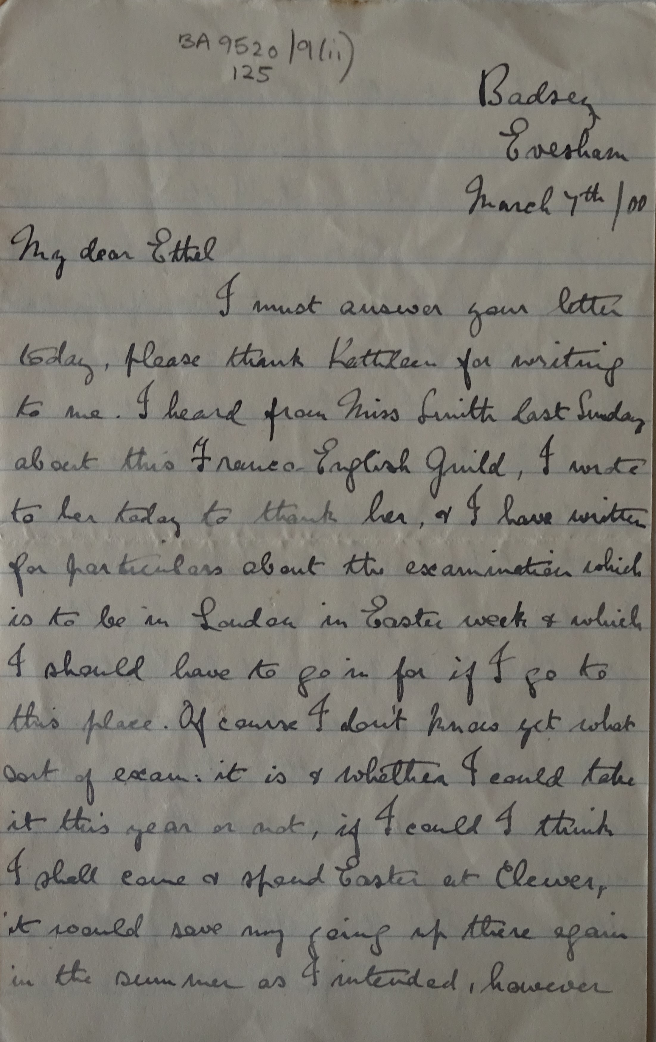 I must answer your letter today, please thank Kathleen for writing to me.  I heard from Miss Smith last Sunday about this Franco-English Guild, I wrote to her today to thank her, & I have written for particulars about the examination which is to be in London in Easter week & which I should have to go in for if I go to this place.  Of course I don’t know yet what sort of exam it is & whether I could take it this year or not, if I could I think I shall come & spend Easter at Clewer, it would save my going up there again in the summer as I intended, however I don’t feel at all certain whether I shall be able to go in.