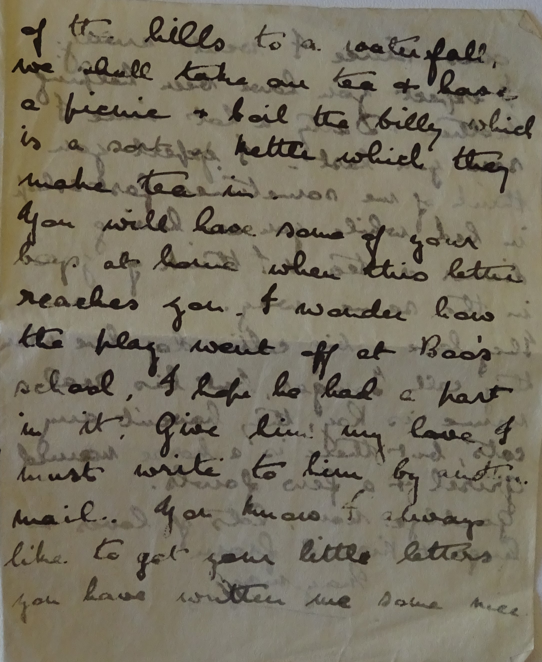 When you get this it will be quite hot summer weather here, even now we sit out in the verandah at the side of the house. There is a beautiful Crimson Rambler just coming out on a summer house in the garden and there are lots of other roses out though they don’t do very well here it is too near the sea. It is not very nice for paddling just here but last Saturday we went to a place called Island Bay where lots of children were paddling and enjoying themselves. You would like scrambling about among the hills here, they are so pretty, tomorrow we are going to walk up one of the hills to a waterfall, we shall take our tea and have a picnic and boil the billy which is a sort of kettle which they make tea in.