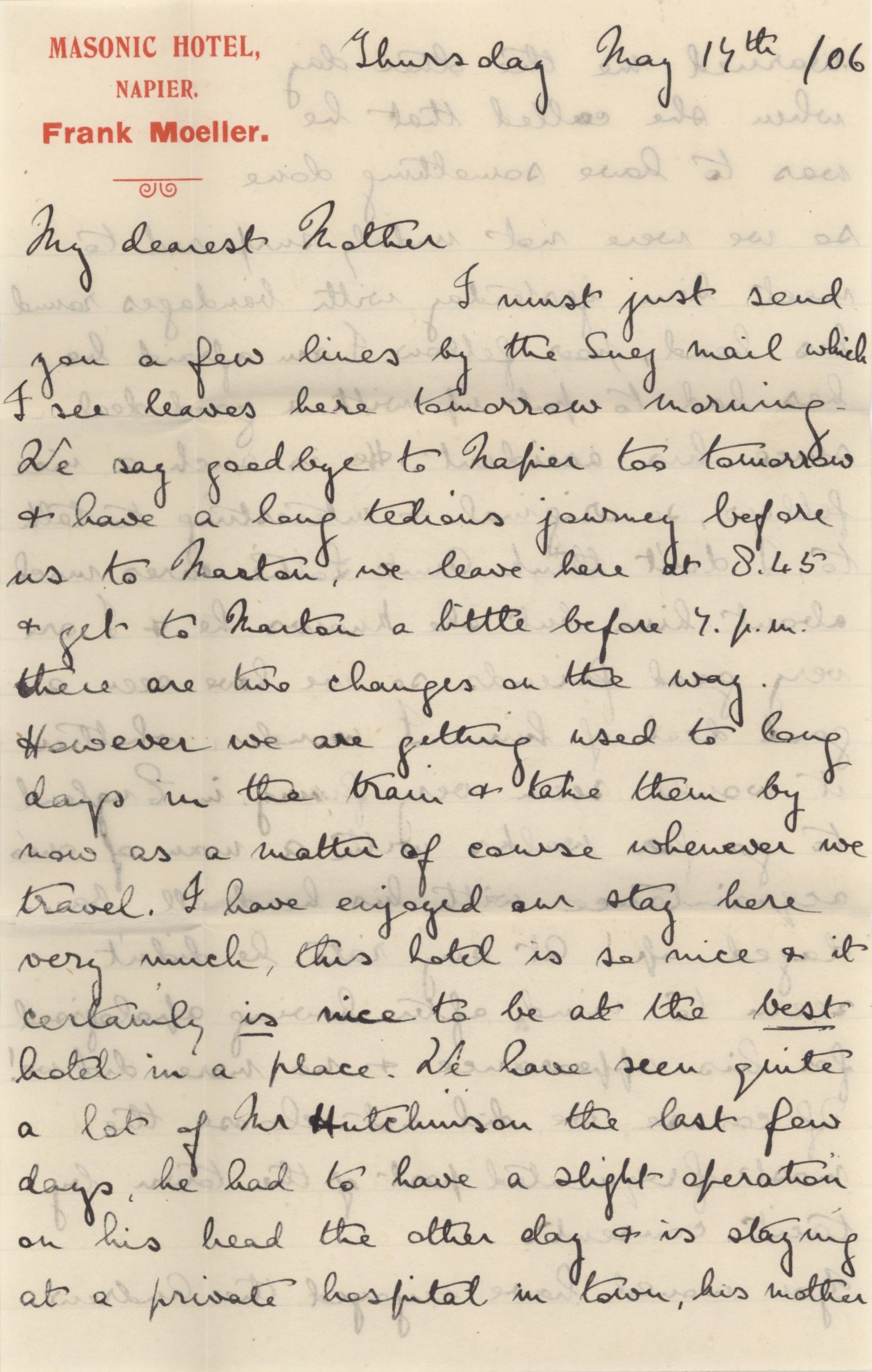 I must just send you a few lines by the Suez mail which I see leaves here tomorrow morning. We say goodbye to Napier too tomorrow & have a long tedious journey before us to Marton, we leave here at 8.45 & get to Marton a little before 7 p.m. there are two changes on the way. However we are getting used to long days in the train & take them by now as a matter of course whenever we travel. I have enjoyed our stay here very much, this hotel is so nice & it certainly is nice to be at the best hotel in a place. We have seen quite a lot of Mr Hutchinson the last few days, he had to have a slight operation on his head the other day & is staying at a private hospital in town, his mother warned me the other day when she called that he was to have something done so we were not unduly surprised to meet him yesterday with bandages round his head, poor fellow I am afraid he has had to put up with a good deal since his accident. He is such a nice fellow, so original & interesting to talk to, I don’t think Aunt Lottie cares much about him but she knows he & I are very good friends so we have seen a good deal of him. I wonder whether it would seem very funny in England to go for walks with a man of one’s acquaintance with his head all bandaged up! At any rate he didn’t seem to mind after having apologies for his appearance & no more did we! Of course we did not choose the most frequented part of the town by tacit consent.
