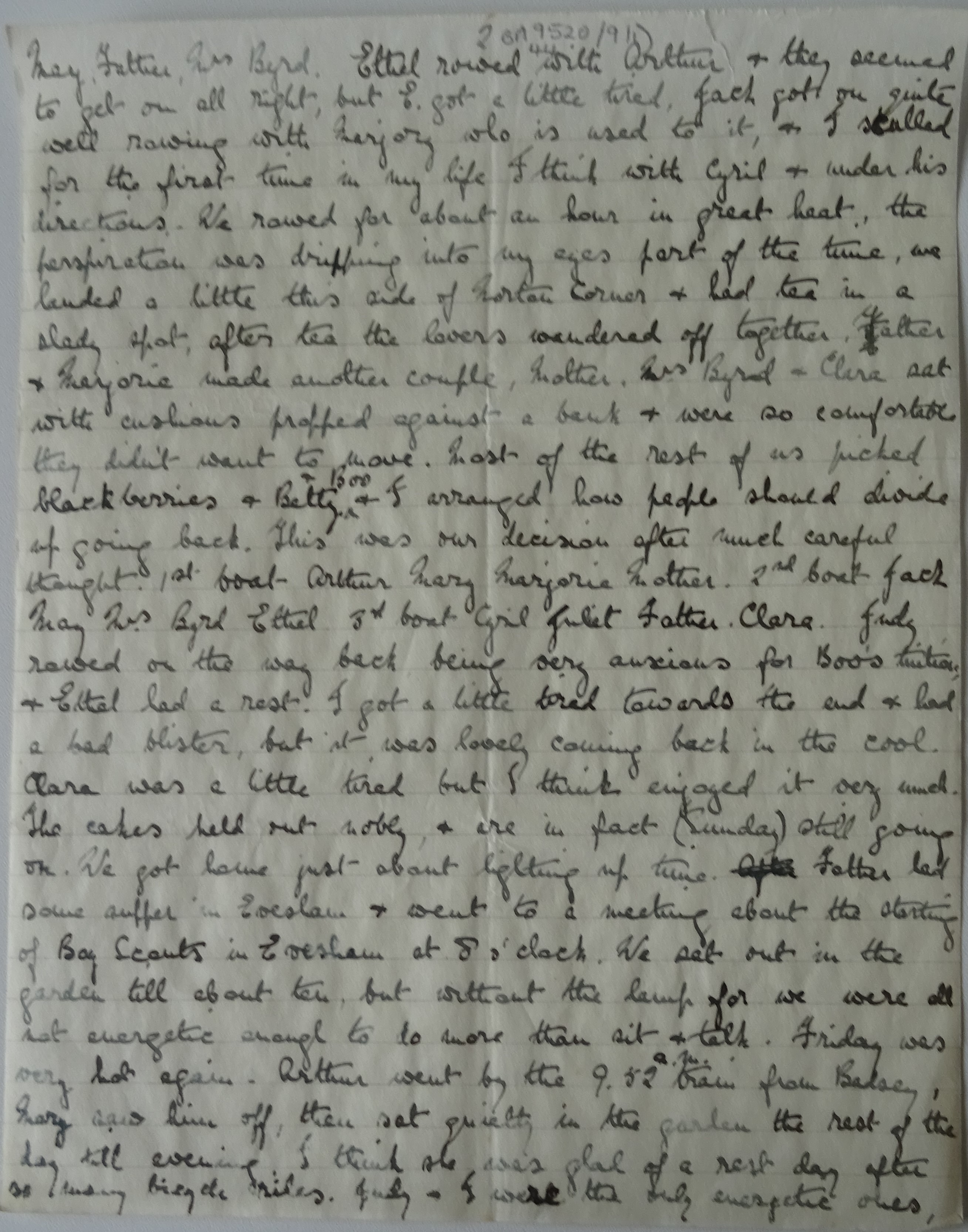 On Thursday morning I went up & met Marjory & we got all the things necessary for cleaning – in all amounting to 17/4 worth, & still there are five irons etc to get. She decided to join us on the river in the afternoon & suggested using the boat they have for the summer, so we asked the Byrds to come, & so were a party of 12, Mother drove up with the Byrds & they took the tea, Father joined us at Spraggs & Marjory was waiting there, we had three boats & went up the river. Going we divided up thus, 1st boat Arthur, Mary, Clara, Ethel; 2nd boat Jack, Marjory, Mother, Juliet; 3rd boat Cyril, Mary, Father, Mrs Byrd. Ethel rowed with Arthur & they seemed to get on all right, but E. got a little tired, Jack got on quite well rowing with Marjory who is used to it, & I sculled for the first time my life I think with Cyril & under his directions. We rowed for about an hour in great heat, the perspiration was dripping into my eyes part of the time, we landed a little this side of Morton Corner & had tea in a shady spot, after tea the lovers wandered off together, Father & Marjorie made another couple, Mother, Mrs Byrd & Clara sat with cushions propped against a bank & were so comfortable they didn’t want to move. Most of the rest of us picked blackberries & Betty & Boo & I arranged how people should divide up going back.