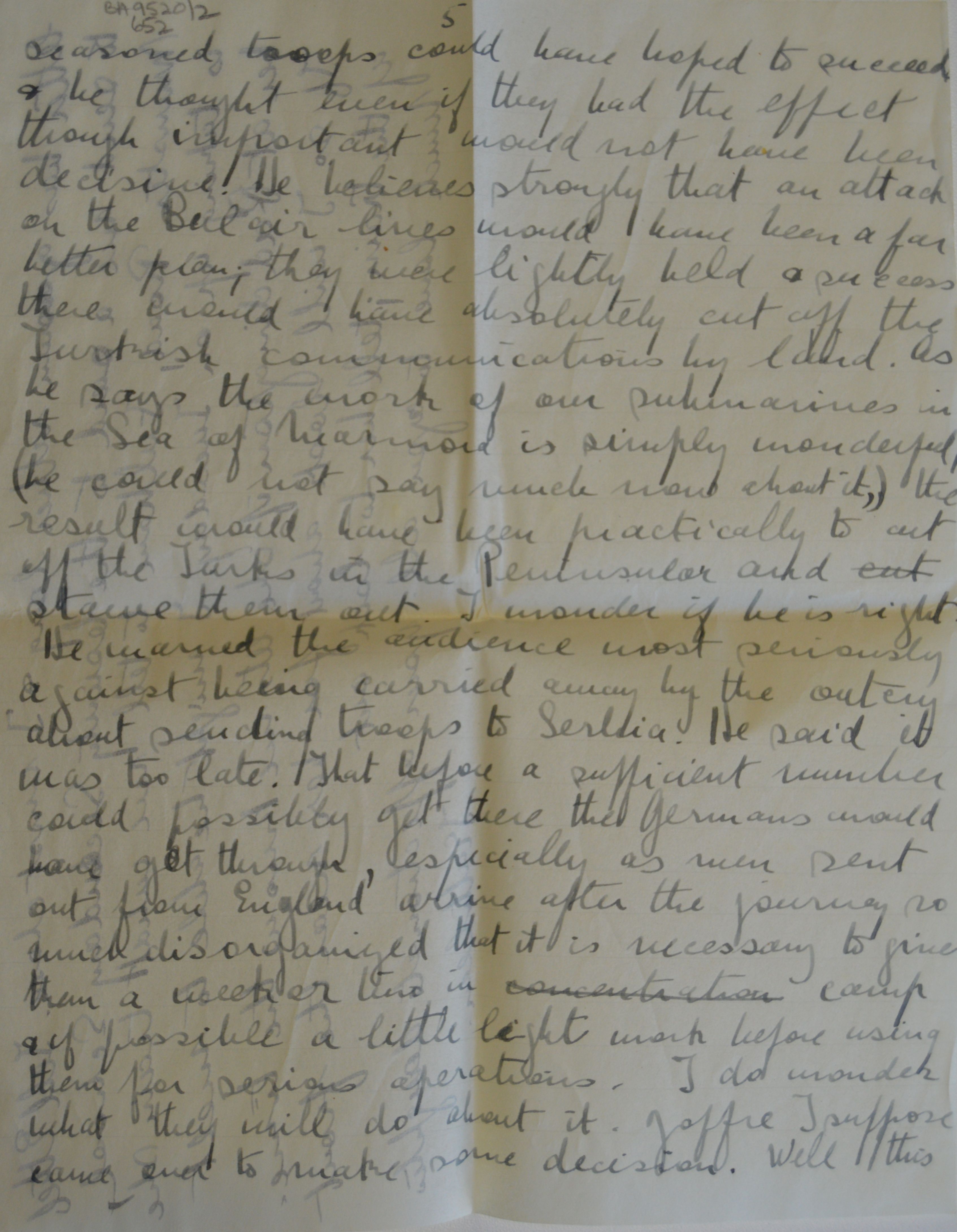 On Wednesday we went to the Queen’s Hall to hear Ashmead Bartlett lecture on the Dardanelles campaign. It was crowded and we only just got in. He was most interesting, gave an account of the whole thing from the beginning, but he thought there had been serious lack of judgment and decision. In his view it was clear by about May this year that the Turks were stronger than had been thought; that after several unsuccessful attacks on Achi Baba, it was clear that it could not be taken by direct assault, at least without much stronger forces than we had; also the appearance of German submarines about then stopped the battleships from giving assistance. At that time, therefore, the whole affair should have been reconsidered and a definite decision made either to get it up or to send enough forces to carry it through; instead of which we muddled on for two more months, losing men in futile attacks and giving Bulgaria time to decide to come in against us. Then when large reinforcements were sent, he considers that it was a great mistake to use them to make the Suvla Bay attempt. It was a most difficult attack; none but seasoned troops could have hoped to succeed and he thought even if they had the effect though important would not have been decisive. He believes strongly that an attack on the Bulgarian lines would have been a far better plan; they were lightly held and success there could have absolutely cut off the Turkish communications by land. As he says the work of our submarines in the Sea of Marmara is simply wonderful (he could not say much more about it) the result would have been practically to cut off the Turks in the Peninsular and starve them out. I wonder if he is right. He warned the audience most seriously against being carried away by the outcry about sending troops to Serbia. He said it was too late. That before a sufficient number could possibly get there the Germans would have got through, especially as men sent out from England arrive after the journey so much disorganised that it is necessary to give them a week or two in camp and if possible a little light work before using them for serious operations. I do wonder what they will do about it. Joffre I suppose came even to make some decision.