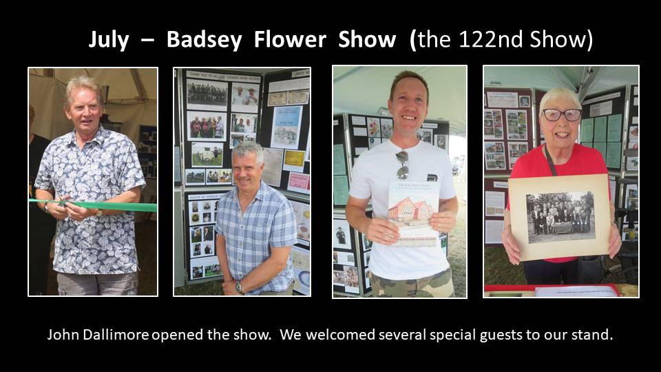 The sun shone on the afternoon of 26th July, the occasion of the 122nd Badsey Flower Show. The Show was officially opened by Badsey Society member, John Dallimore. There was a lovely atmosphere, families having fun, lots of exhibits in the marquee, and good entertainment. At the Badsey Society stand, we welcomed many visitors, including Robin Sladden, great-grandson of Sir Julius Sladden, one of the founders of the Flower Show back in 1888 and James Archer, great-grandson of John Henry McDonald, a former Headmaster of Badsey Council School.
