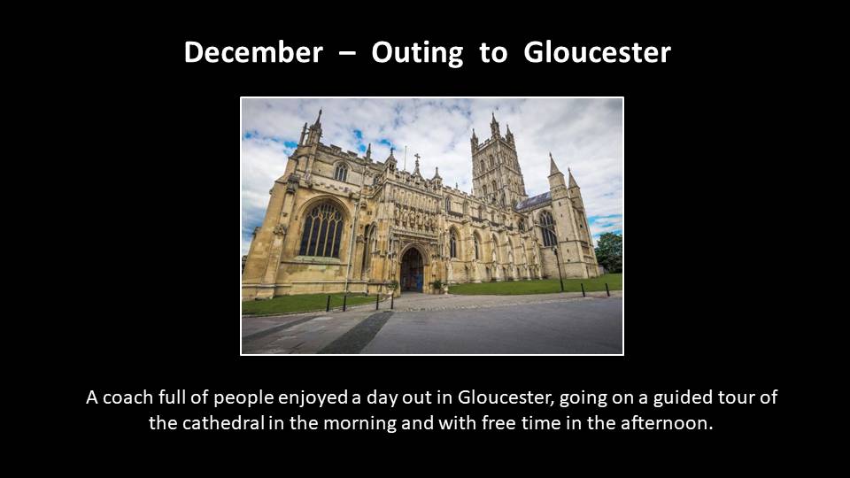 We enjoyed an excellent day out to Gloucester. We were welcomed with coffee and cookies before splitting into two groups for tours of the cathedral and the crypt. A buffet lunch was served in the Parliament Room, then members were free to explore the city on their own.