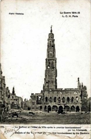 William went to France on 12th January 1916, was demobilised on 6th March 1919 and awarded the British War and Victory medals. Whilst in France, William wrote a postcard to his father, Robert, at Rosebank, Wickhamford , dated 4th August 1916. It pictures a badly damaged Arras Town Hall and says: “Dear Dad, Just send this picture of a mess that will have to be cleared up later on. Love to all, Will.”